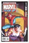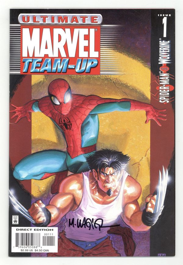 painted cover by matt wagner. brian michael bendis/matt wagner. ? THE SCOOP: The world's most popular characters unite in the fantastic 1st issue of the all-new ULTIMATE series! ? THE STORY: Canadian agents?led by Sabretooth?follow the wild man named Wolverine from the pages of ULTIMATE X-MEN straight to New York City! Hey, isn't that the hometown of the teenaged sensation known as Spider-Man? That's right, the ultimate encounter between comics' biggest stars starts right here! (So what heroes are on deck? Expect Iron Man, Captain America, the Hulk, the Fantastic Four... you know, cool Marvel heroes!) ? THE CREATORS: He's the hottest writer in the biz... and Brian Michael Bendis is pumped about teaming up with a smorgasbord of awesome artists! "The initial artist line-up is: Steve Rude (SPIDER-MAN: LIFELINES), P. Craig Russell (The Ring of the Nibelung), Bill Sienkiewicz, Dave Gibbons (Watchmen), Terry Moore (Strangers in Paradise), Dan Brereton (Nocturnals), John Romita Sr., Jon Totleben (Swamp Thing), Zander Cannon (Top 10), Mike Avon Oeming (Powers), John Romita Jr., Phil Jimenez (Wonder Woman), Jim Mahfood (GENERATION X UNDERGROUND), David Mack (DAREDEVIL), Phil Hester (Green Arrow) and Mike Allred (The Atomics)! This series will the ULTIMATE audience how artistically divers the art of comics can be." And before we get to any of those greats, we'll be treated to the art of Matt Wagner (Grendel, Mage), who also paints this issue's cover! ? THE WRITER SPEAKS: Bendis recently told CSN that, "This book is more than a modern reinterpretation of the characters, it's a celebration of what Marvel Comics stands for! In every issue of this title readers will be introduced, as Joe Quesada likes to say, Marvel-Freakin' Comics! High quality artists dazzling readers with good old fashion Marvel fun!" ? THE FORMAT: 48 pages, with ads. Printed on that slick ULTIMATE paper and thick cover! Cover price $2.99.