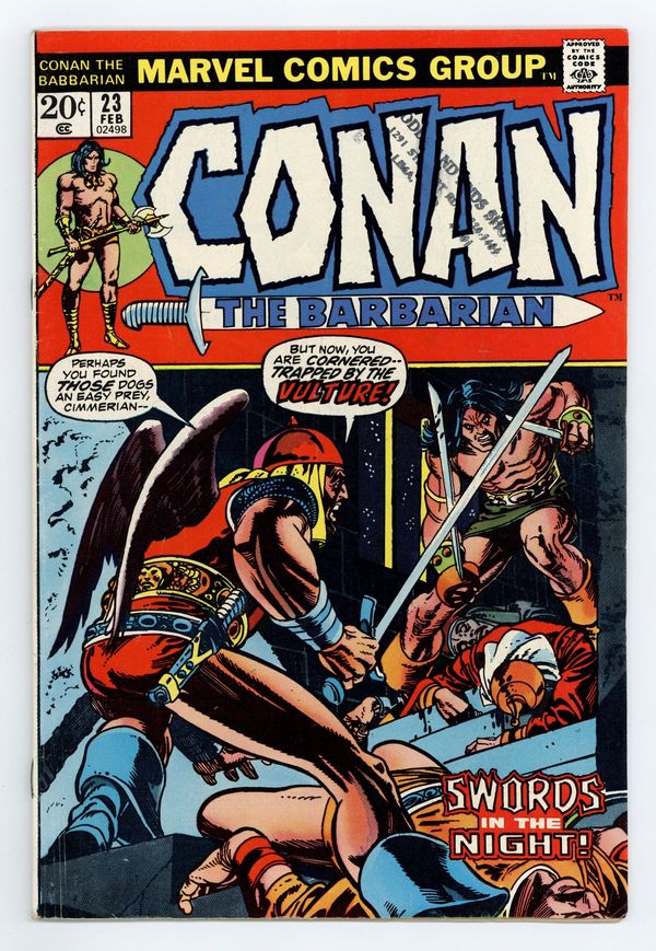 Cover art by Gil Kane. First appearance of Red Sonja in The Shadow of the Vulture, script by Roy Thomas, pencils by Barry Windsor-Wmith, inks by Sal Buscema, Dan Adkins, and Chic Stone; setting: Pah-Dishah, Makkalet; Conan delivers message from Makkalet to Pah-Disha; Red Sonja saves Conan's life twice; Conan kills Mikhal Oglu (vulture) and sends his head to Yezdigerd; adapted from the non-Conan story by Robert E. Howard featuring a female warrior, Red Sonya. 36 pgs. Cover price $0.20. Cover price $0.20.