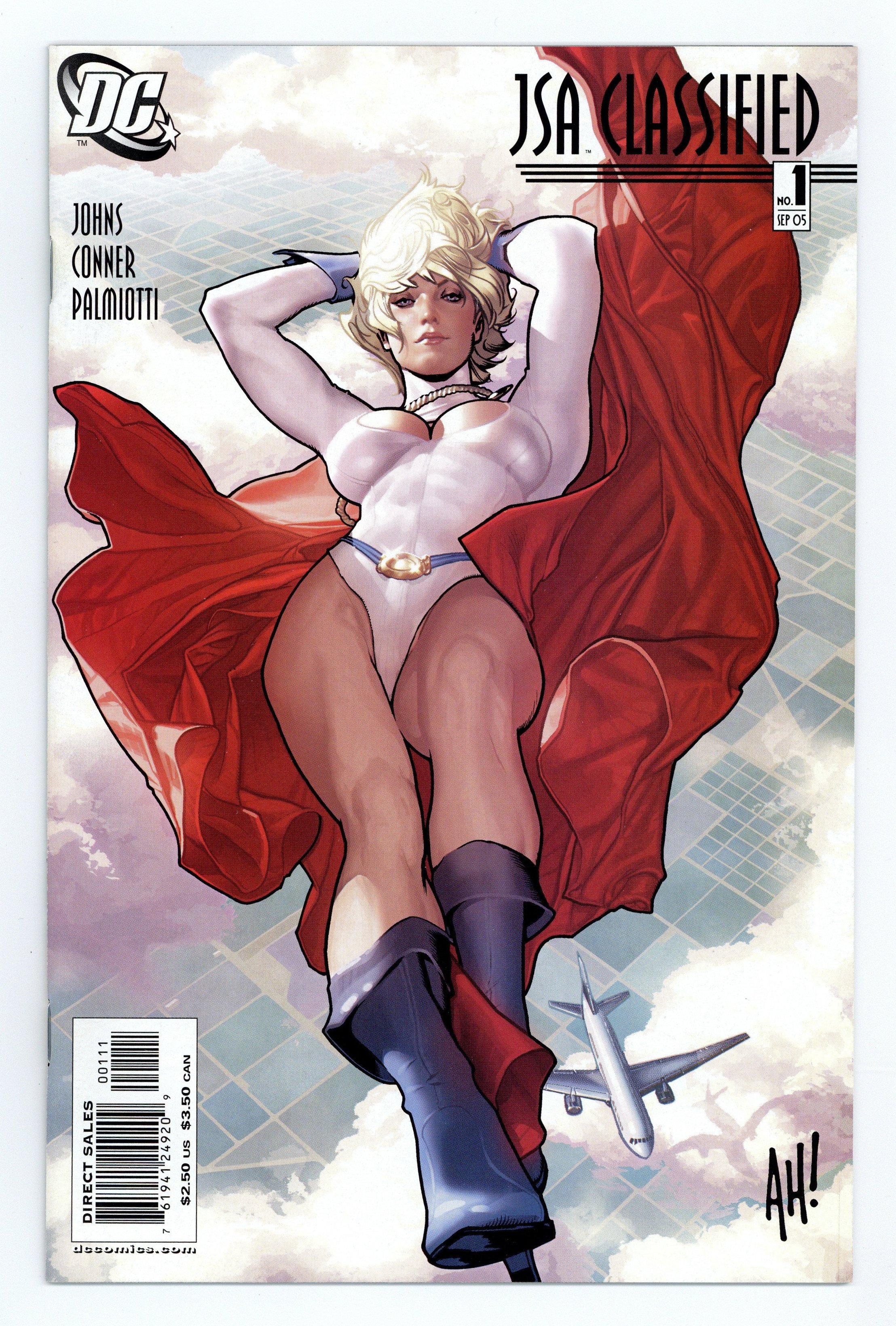 Adam Hughes Cover 1st Printing - Written by Geoff Johns, Art by Amanda Conner & Jimmy Palmiotti, Covers by Conner, Palmiotti, and Adam Hughes. Spinning from the events of July's JSA #75, a highly anticipated new JSA series debuts with a story written by Geoff Johns (JSA, TEEN TITANS) with art by Amanda Conner & Jimmy Palmiotti (TWO-STEP) that spotlights everyone's favorite female juggernaut: Power Girl! Readers have long wondered about Power Girl's origins. Is she a wizard's lost granddaughter? A refugee from the future? An orphan of Krypton? Now learn the unexpected answers in an adventure that acts as a prelude to this fall's massive crossover event that will affect the JSA for years to come! Retailers please note: This issue will ship with two covers by Amanda Conner & Jimmy Palmiotti (50%) and Adam Hughes (50%). On sale July 20 ? 32 pg, FC, $2.50 US Edited by Stephen Wacker Cover price $2.50.