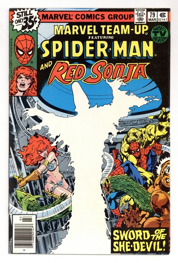 "Sword of the She-Devil" Guest-starring Spider-Man and Red Sonja. Plot and Script by Chris Claremont. Plot and Pencils by John Byrne. Inks by Terry Austin. Cover by John Byrne and Terry Austin. An emergency situation is developing at the Metropolitan Museum of Art! The Daily Bugle dispatches Peter Parker and a reporter to the site, but someone else sneaks along...Mary Jane Watson! The web-slinger quickly enters the museum and is attacked by grotesque monsters! Mary Jane rushes inside to help the struggling wall-crawler, but what can she do? How about grab the ancient sword of Red Sonja! And in a dazzling transformation...Mary Jane Watson becomes Red Sonja! Now the Amazing Spider-Man and the She-Devil with a Sword team up against the evil sorcerer Kulan Gath! Will New York City survive...and Ms. Watson too? An excellent story! Cameo appearance by Clark Kent on page 3. (Notes: This is a key appearance of Mary Jane Watson during the time period (between 1979 and 1983) when she rarely appeared in any of the Spider-Man titles. Kulan Gath appears next in Uncanny X-men 190. This is the final issue of the Claremont-Byrne run on the Marvel Team-Up title. This issue was reprinted in Marvel Tales 208.) 36 pages. Cover price $0.35.