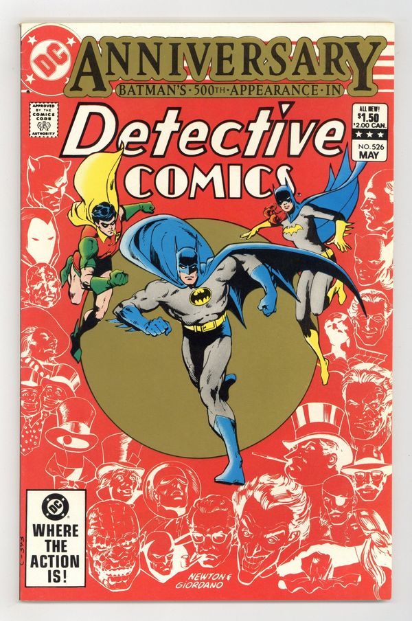 Tags: Giant-Sized Issue, Batman$20.50Direct Edition. This special 68-page square-bound giant edition commemorates Batman's 500th appearance in Detective Comics. The lead story for this issue, "All My Enemies Against Me!" kicks off with an impressive two-page splash featuring a rogue's gallery of Batman's greatest foes--17 of Gotham's worst villains. The Joker isn't depicted only because he arrives late to the council of criminals. It's one wild, book-length saga as Batman, Robin and Batgirl mix it up with the 17, plus the Joker, Catwoman and Killer Crock. This enjoyable story is written by Gerry Conway with impressive art by Don Newton and skilled inking from Alfredo Alcala. 68 pgs. Cover price $1.50.