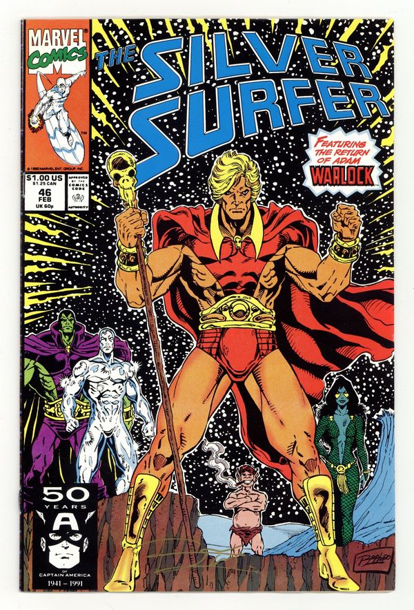 Direct Edition. Infinity Gauntlet: Prelude - "...The Soul World!" Featuring the return of Adam Warlock. Guest-starring Drax the Destroyer. Story by Jim Starlin. Art by Ron Lim and Tom Christopher. Utterly defeated by Thanos, the Silver Surfer and Drax the Destroyer awaken in the mysterious Soul World. While, Drax is kept busy by Gamora, the most dangerous woman in the universe, Norrin Radd seeks the council of the master of this realm...the enigmatic Adam Warlock. Cover price $1.00.
