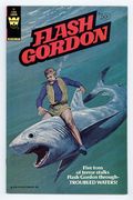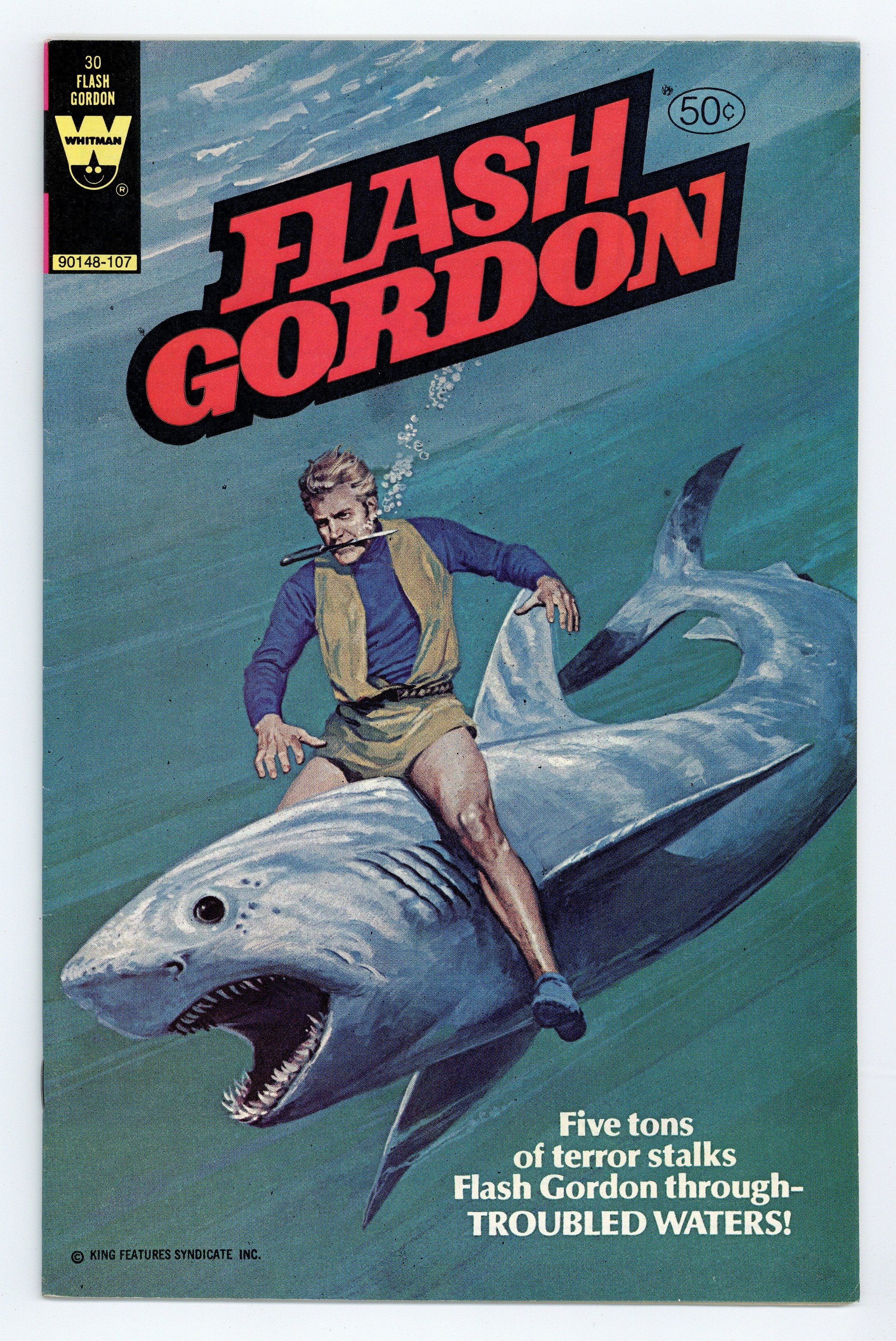 Whitman edition. # on cover is 90148-107. This is a reissue and more common. Painted cover by Chuck Liese. Stories by John Warner. Art by Gene Fawcette and Carlos Garzon. The continuing adventures of Flash Gordon, Dale Arden and Dr. Zarkov on the planet Mongo. This issue features art by Carlos Garzon, longtime assistant to EC legend Al Williamson. Continuing their exploration of Mongo's Cave Kingdom, Flash and Dale encounter a city on the sea and a subterranean monster. Flash tries to help the people of the cave kingdom rebel against the rule of the tyrannical king Requin. Great shark cover painted by Chuck Liese. Publication of this variant was delayed due to a change in the release date of the 1980 Flash Gordon film. Troubled Waters. 32 pages, full color. Cover price $0.50.