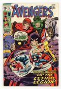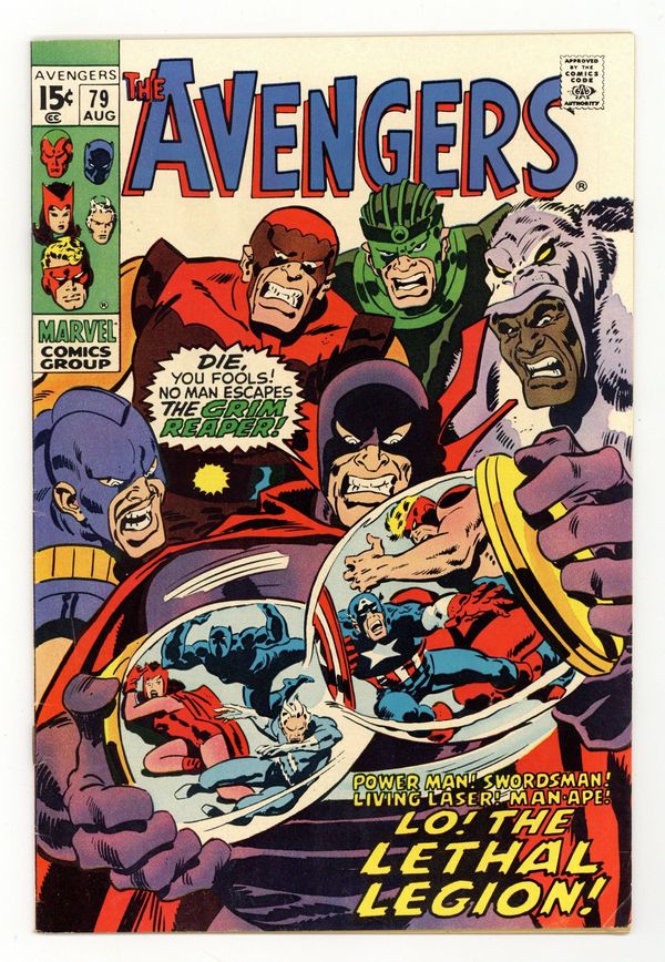 Tags: Marvel Legacy Numbering: Avengers (part 79), Avengers$15.50"Lo! The Lethal Legion!" Part 2 of 2. Script by Roy Thomas. Pencils by John Buscema. Inks by Tom Palmer. Cover by John Buscema. The Grim Reaper is back with a new scheme to destroy the Avengers! And this time Eric Williams has brought along some super-powered helpers: the Swordsman, Living Laser, Power Man, and the Man-Ape! Truly a Lethal Legion! But Earth's Mightiest Heroes have responded by summoning the golden avenger and the thunder god to their ranks! After the Black Panther momentarily escapes and warns his teammates about the reaper's plan, the colossal clash begins! The Mighty Avengers vs. the Lethal Legion in the heart of Avengers Mansion! While the battle rages the Grim Reaper's gang appears to seize the upper hand, but looks can be deceiving! As the Vision will prove! Avengers Lineup: Black Panther, Captain America, Goliath, Iron Man, Quicksilver, Scarlet Witch, Thor, and the Vision. (Notes: The Grim Reaper returns in Avengers 102. The Swordsman appears next in Avengers 100. The Grim Reaper discovers the connection between Wonder Man (aka Simon Williams) and the Vision in this issue. This story was reprinted in 1993 in the trade paperback: The Greatest Battles of the Avengers.) 36 pages. Cover price $0.15.