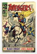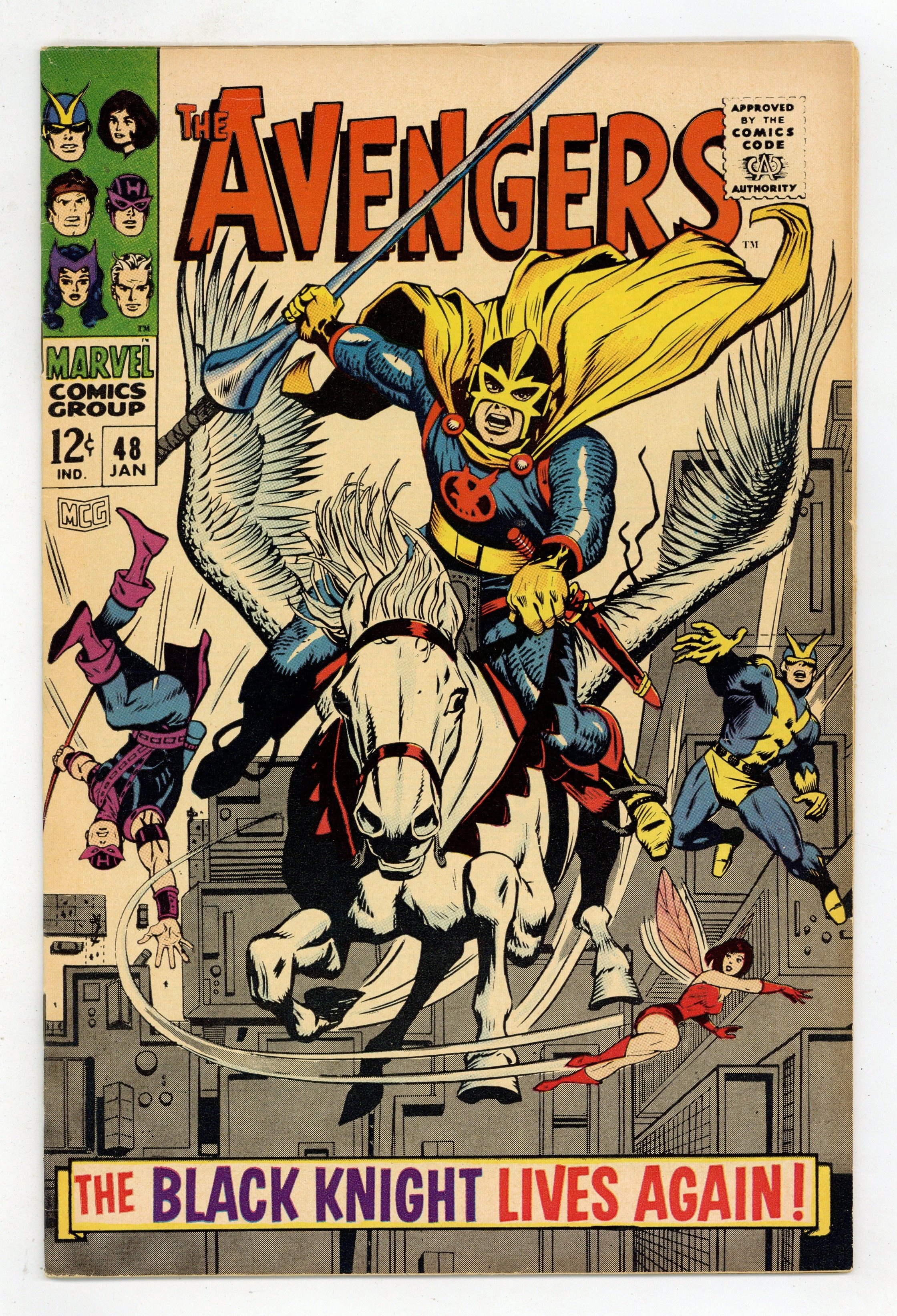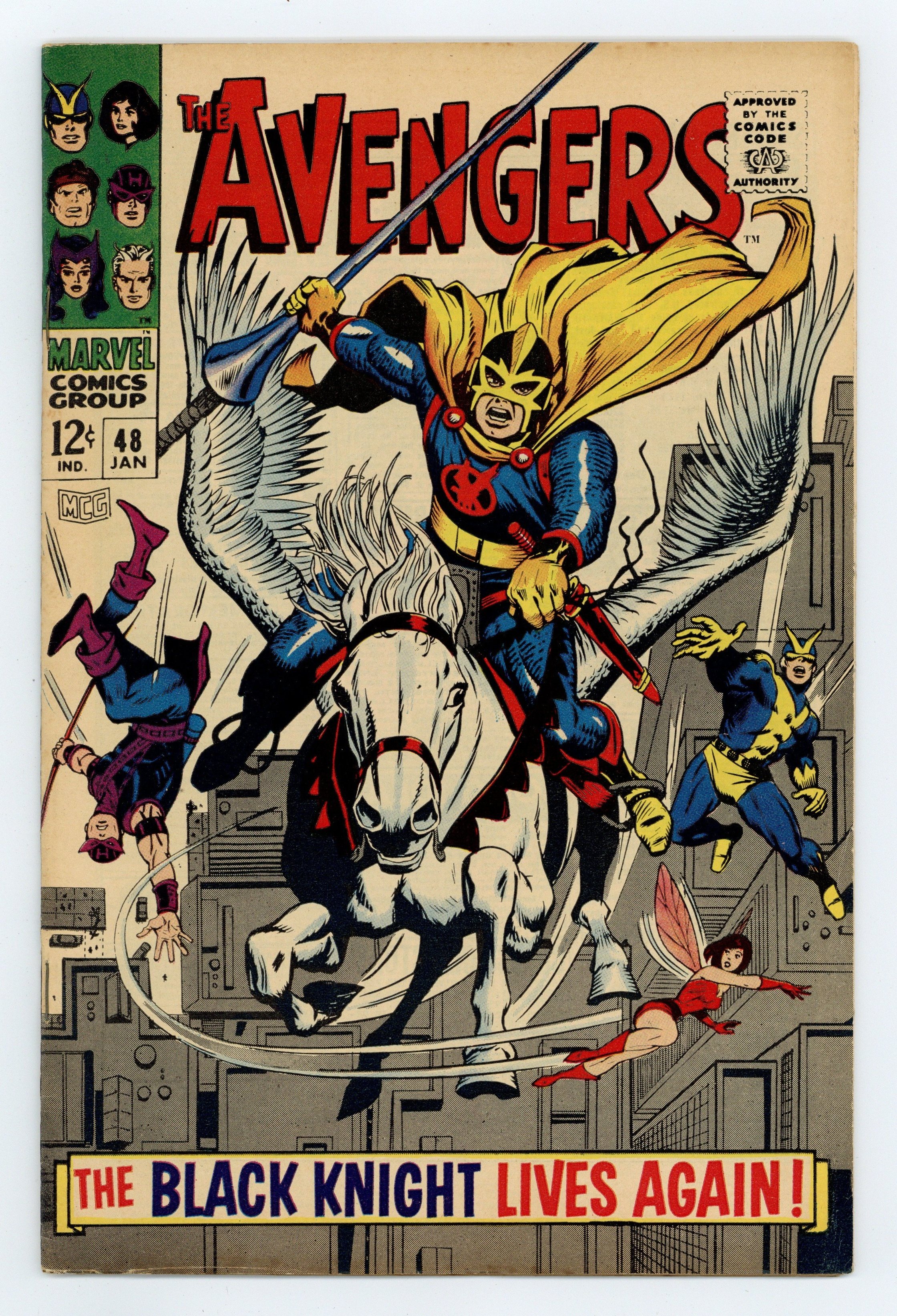 Tags: Marvel Legacy Numbering: Avengers (part 48), Avengers$59.00First appearance of the new Black Knight (aka Dane Whitman) in "The Black Knight Lives Again!" Script by Roy Thomas. Art by George Tuska. Cover by George Tuska. Inside Garrett Castle Quicksilver and the Scarlet Witch are prisoners of Magneto! And the Master of Magnetism is admonishing them to rejoin the brotherhood! While elsewhere in the castle, a stunning transformation is occurring as Dane Whitman decides to take up the mantle of the Black Knight! Dane wants the knight to become a force for good! So, his first act is to fly to Avengers Mansion and tell the Avengers about Wanda and Pietro's plight! But Earth's Mightiest Heroes mistake Dane for the evil Black Knight and attack! Will the new knight's career be over before it even starts? Meanwhile in Olympus, Hercules discovers the Temple of the Promethean Flame in ruins and his fellow gods missing! Origin of the new Black Knight. First appearance of Aragorn - the winged horse. Cameo appearances by Jarvis and the Toad. Flashback cameo by Nathan Garrett - the previous Black Knight. Avengers Lineup: Hawkeye, Goliath (aka Hank Pym), Hercules, Quicksilver, Scarlet Witch, and the Wasp. (Notes: The letters page includes a letter from comics historian Peter Sanderson. This issue was reprinted in Marvel Triple Action #40.) 36 pages, full color. Cover price $0.12.