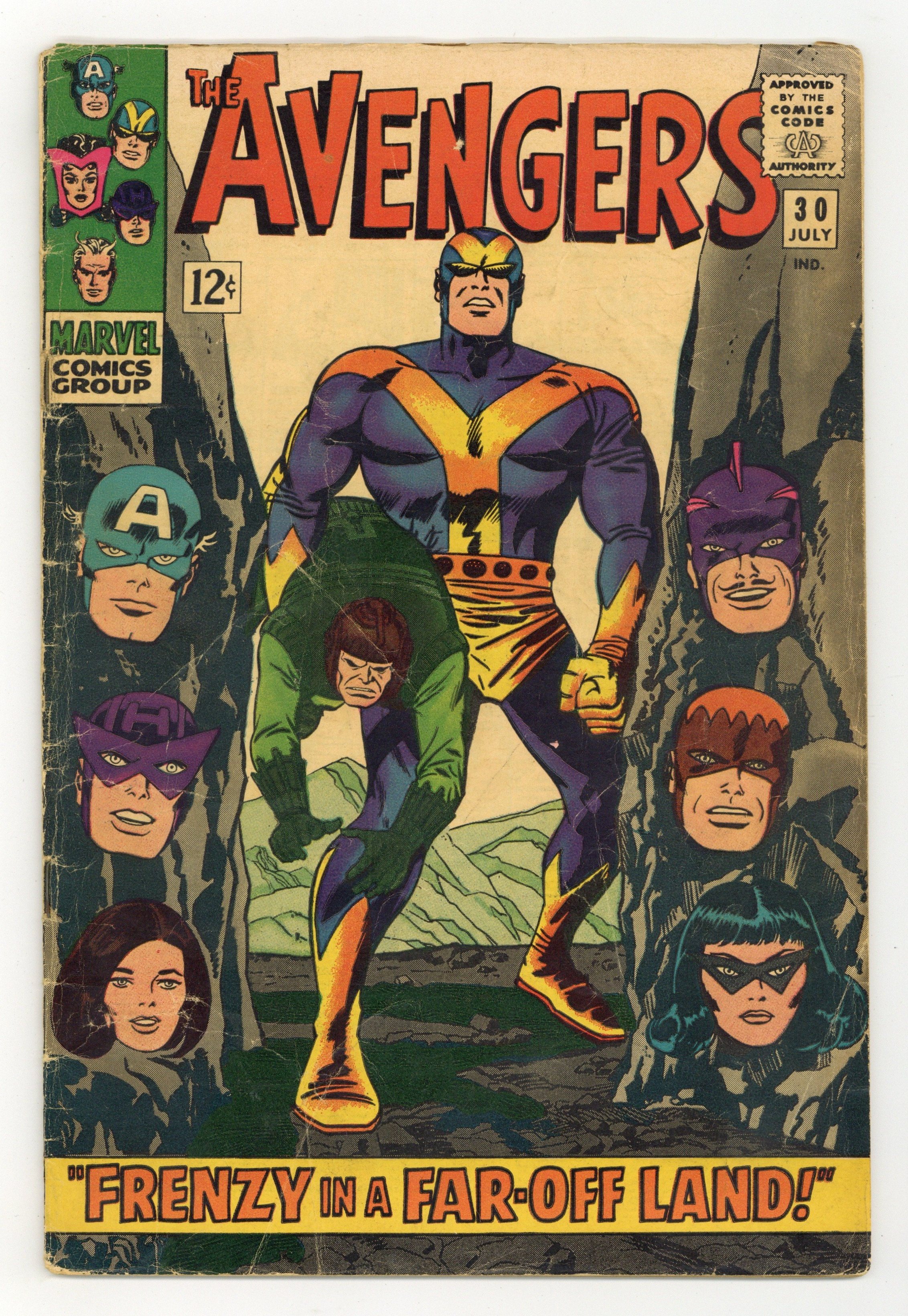 Tags: Marvel Legacy Numbering: Avengers (part 30), Avengers$19.50Cover pencils by Jack Kirby, inks by Frank Giacoia. "Frenzy in a Far-Off Land," script by Stan Lee, pencils by Don Heck, inks by Frank Giacoia; Quicksilver and the Scarlet Witch take a leave of absence from the Avengers due to their dwindling powers; Goliath also sets off to South America to try and find a cure, hearing his old college professor Dr. Anton is there; Black Widow is ordered to destroy the Avengers again with the help of the Swordsman and Power Man; The Avengers find the Black Widow and co. but Hawkeye wants to go alone, as it is personal to him; Meanwhile, Goliath lands in South America and finds Dr. Anton has been captured by the Keeper of the Flame; He tries to save him, but is overwhelmed then brought to safety by Prince Rey, who leads a rebel force against the Keeper; Hawkeye defeats the Swordsman but is trapped by Power Man; The Black Widow saves him, finding herself unable to harm Hawkeye as she loves him; Captain America and the Wasp leave to help Goliath. Avengers roll call: Captain America, Hawkeye, Goliath, the Wasp, and, briefly, Quicksilver and the Scarlet Witch. 36 pgs., full color. $0.12. Cover price $0.12.