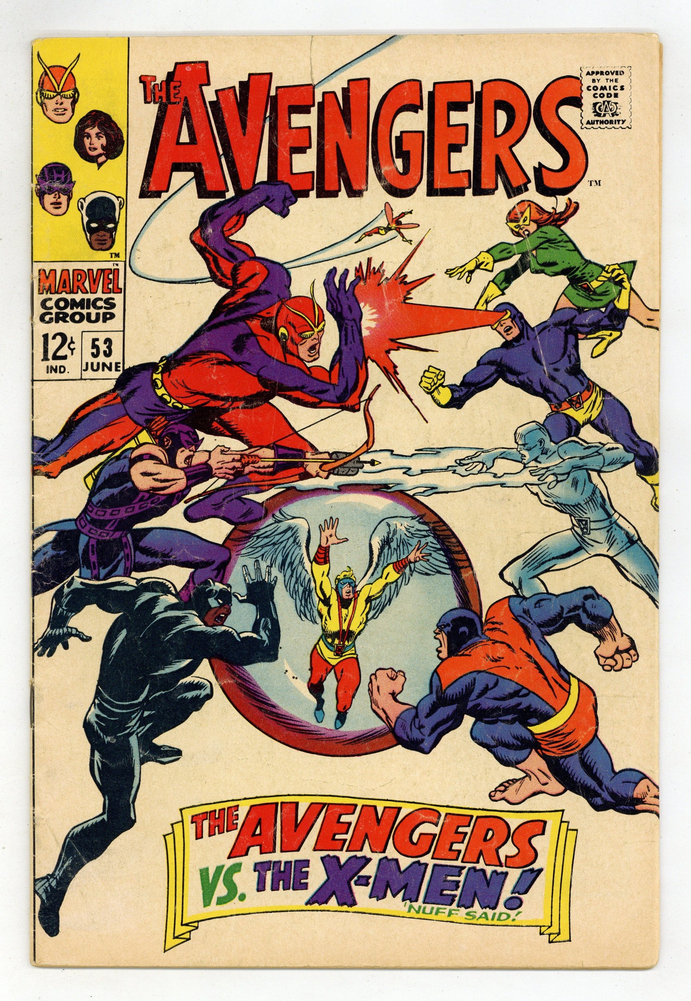 "In Battle Joined!" Guest-starring the X-Men. Script by Roy Thomas.Pencils by John Buscema. Inks by George Tuska. Cover by John Buscema and George Tuska. Story continues from Uncanny X-Men (1963 1st series) #45. After rendezvousing with the Angel, Earth's Mightiest Heroes arrive on Magneto's Atlantic Island ready to take down the Master of Magnetism! However the powerful mutant has a plan to turn the captive X-Men against the Avengers! And in Magneto's lair, Magneto's plan usually works! So it's the Mighty Avengers vs. the Uncanny X-Men for the freedom of the world! Duringthe chaotic battle, Pietro and Wanda look for a way to get off the island! Maybe the Toad will help them! But first he has a surprise for his magnetic master! Avengers Lineup: Black Panther, Goliath, Hawkeye, and the Wasp. X-Men Lineup: Angel, Beast, Cyclops, Iceman, and Marvel Girl. (Notes: Magneto appears next in Uncanny X-Men #62. He battles Earth's Mightiest Heroes again in Avengers 110 & 111. Quicksilver and the Scarlet Witch appear next in Amazing Spider-Man #71. They return to the team in Avengers #75. This story was reprinted in Marvel Triple Action #46 and also in Avengers 350.) 36 pages. Cover price $0.12.