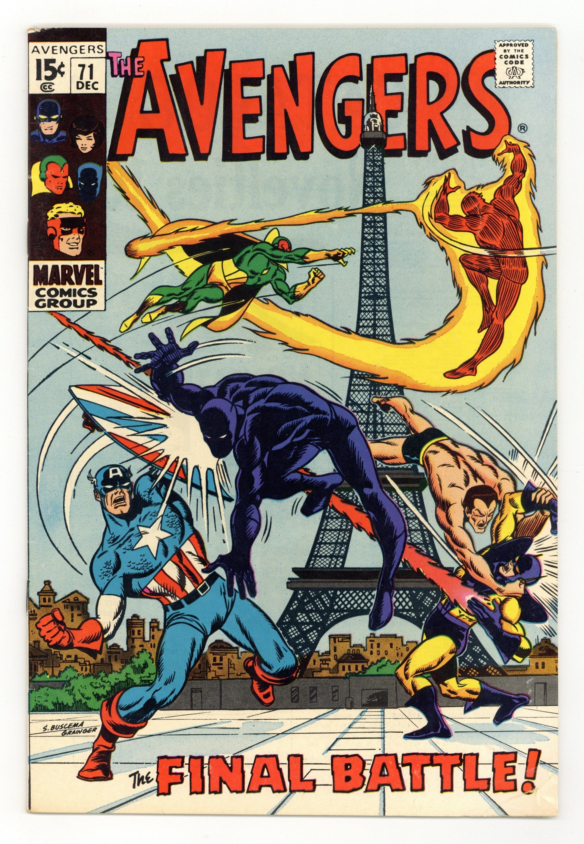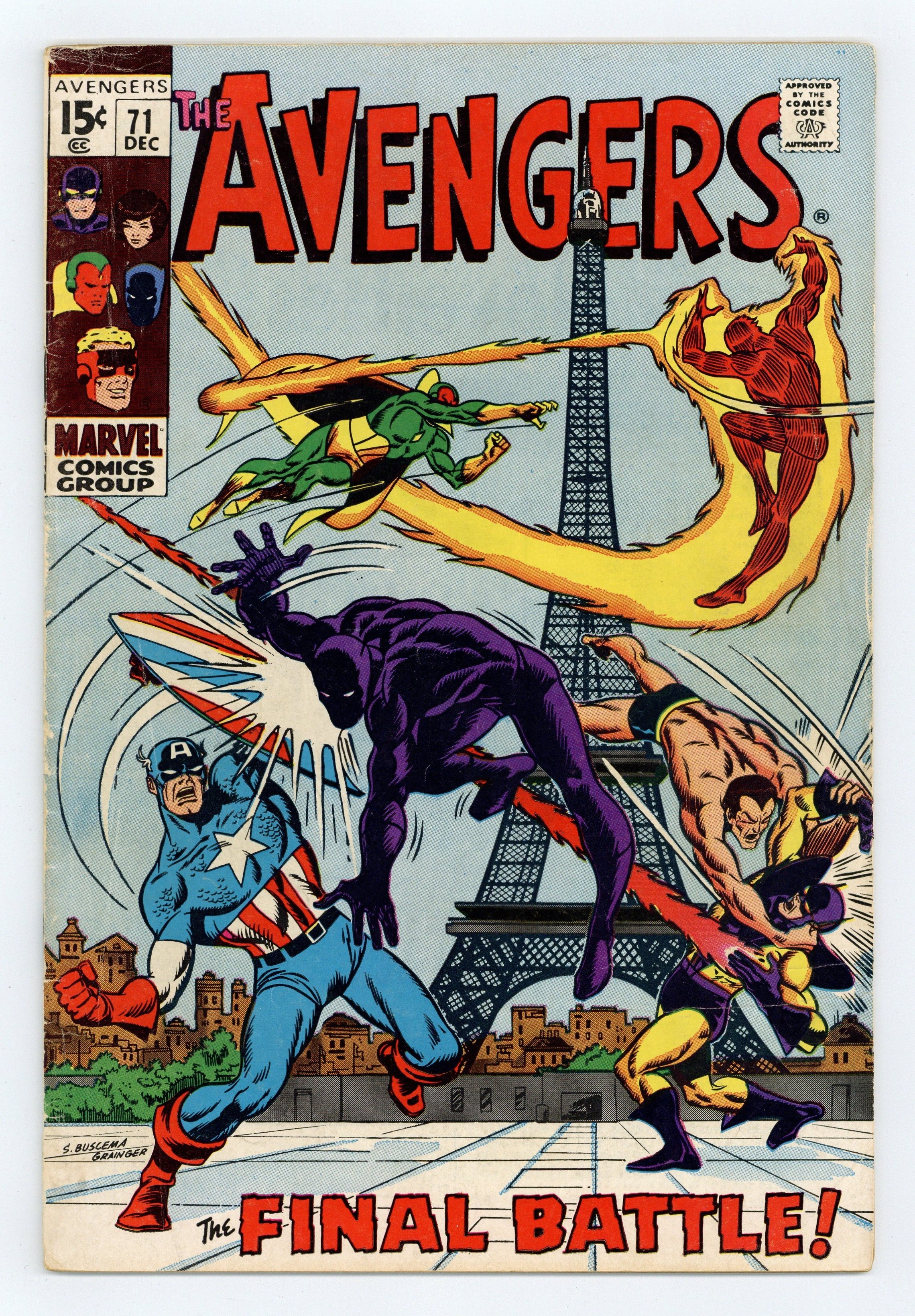 "Endgame!" Part 3 of 3. Guest-starring the Invaders (first appearance). Script by Roy Thomas. Pencils by Sal Buscema. Inks by Sam Grainger. Cover by Buscema and Grainger. The Avengers battle the Invaders in 1941 occupied France! Cameo appearances by Ravonna and the original 6th century Black Knight (aka Sir Percy). Notes: The plot of Avengers 71 overlaps with Invaders Annual 1 published eight years later in 1977. The last page is a pin-up featuring the Avengers. Kang returns in Incredible Hulk 135. This is the second appearance of the original Human Torch in Silver Age/Bronze Age continuity. This issue was reprinted in Marvel Super Action 32 and Giant Size (2008) Avengers Invaders. 36 pages. Cover price $0.15.