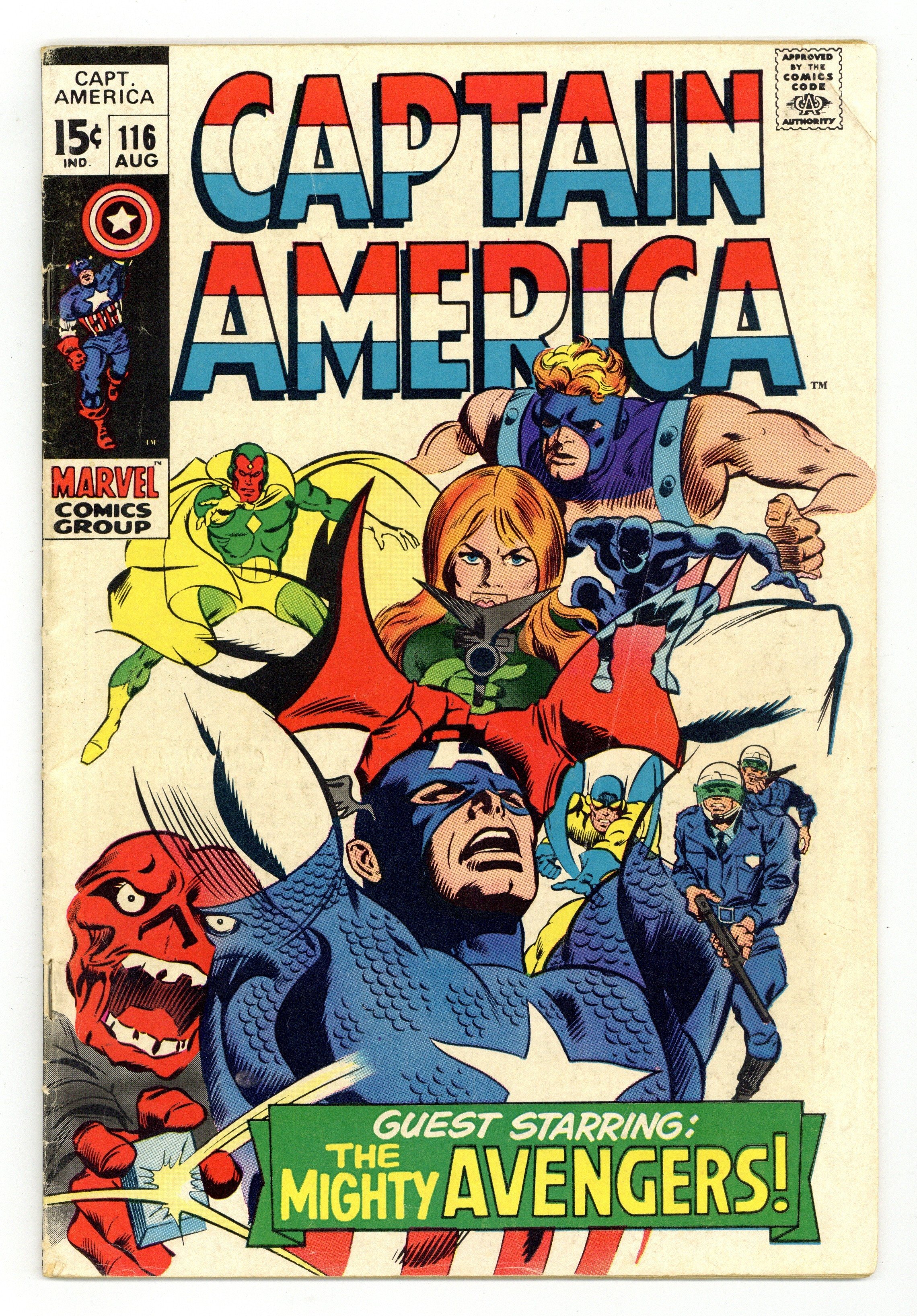 Tags: Marvel Legacy Numbering: Captain America (part 116), Captain America$37.50First 15-cent cover price. Cover pencils by Gene Colan, inks by Joe Sinnott. The Red Skull is still in Cap's body in "Far Worse Than Death!", script by Stan Lee, pencils by Gene Colan, inks by Joe Sinnott; Red Skull transports Captain America outside a government testing lab, wheres hes shot at; Red Skull is disgusted that people admire him since they think he is Captain America, wondering why he doesnt lord it over the people who worship him; Cap, in the Red Skulls body, gets in a high speed chase with the police and then battles the Avengers; The Red Skull uses the Cosmic Cube make Sharon Carter try to kill Captain America. The Black Panther appears on the cover but is not in the story. The Black Panther appears on the cover but is not in the story. 36 pgs., full color. $0.15. Cover price $0.15.