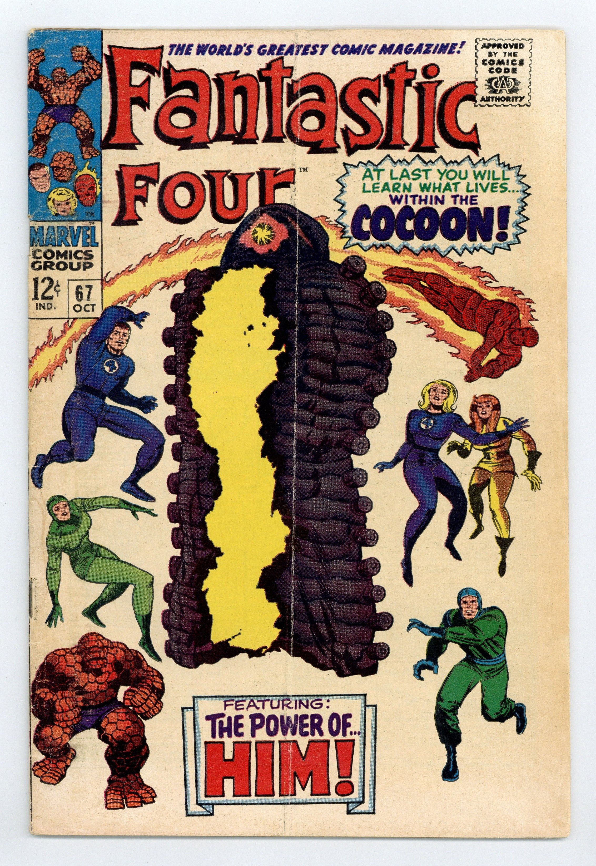 1st printing. Cover pencils by Jack Kirby, inks by Joe Sinnott. Origin (part 2) and first appearance of Him (Warlock) in "When Opens the Cocoon!", script by Stan Lee and Jack Kirby (co-plot), pencils by Jack Kirby, inks by Joe Sinnott; The FF track the kidnapped Alicia to the Beehive, where the cocoon opens and reveals Him. Crystal (of the Inhumans) appearance. 36 pgs. $0.12. NOTE: 1994 JC Penney reprint exists. Can be identified by having a Stridex ad on the back cover. Cover price $0.12.