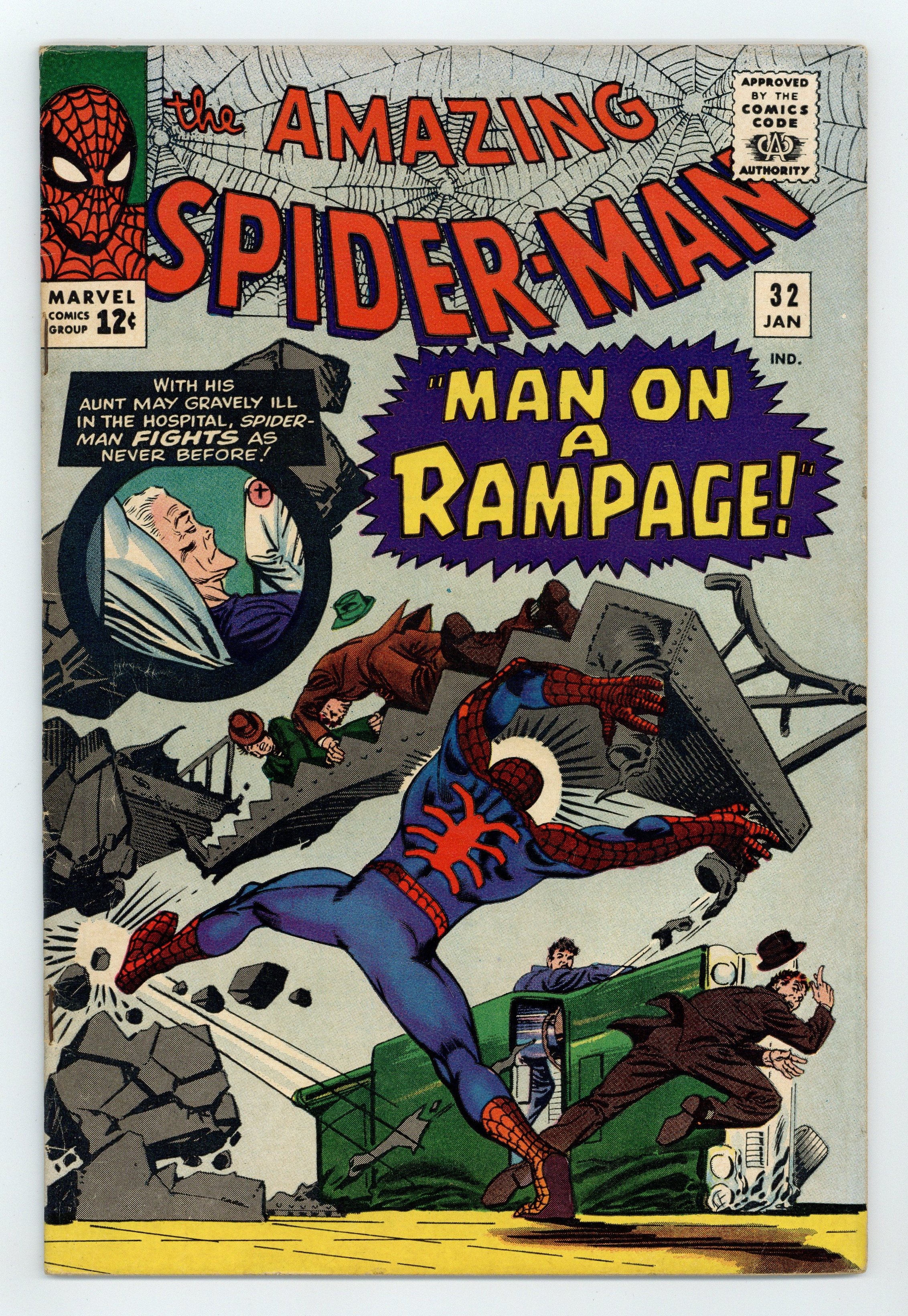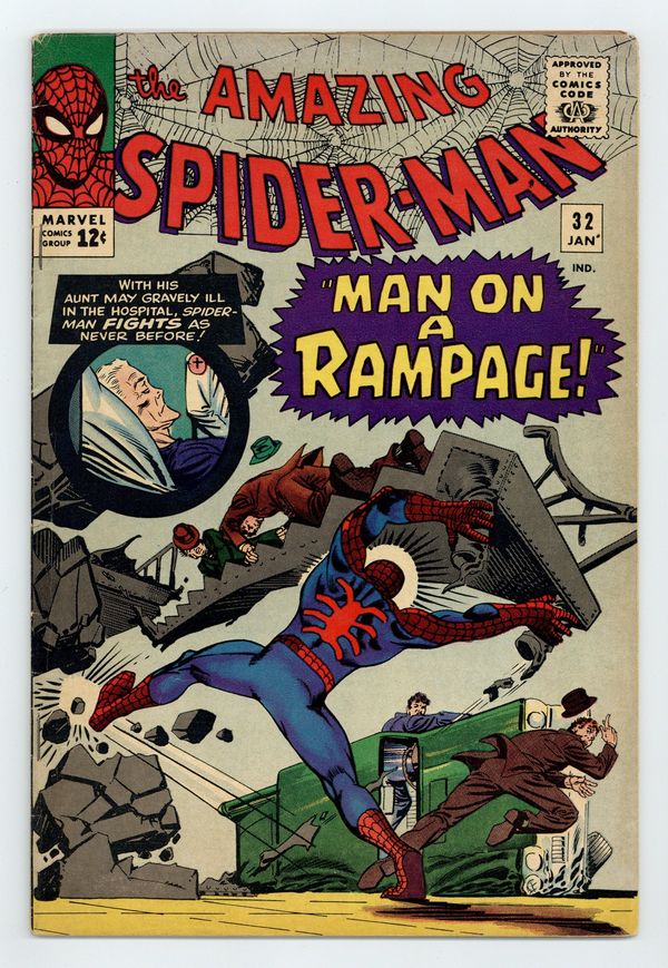 Doctor Octopus (the Master Planner) in "Man on a Rampage." Script by Stan Lee, art and cover by Steve Ditko. In a battle with Doctor Octopus, Spider-Man gets trapped under tons of steel. Reprinted in Marvel Tales # 25 and 171. 36 pgs. Cover price $0.12.