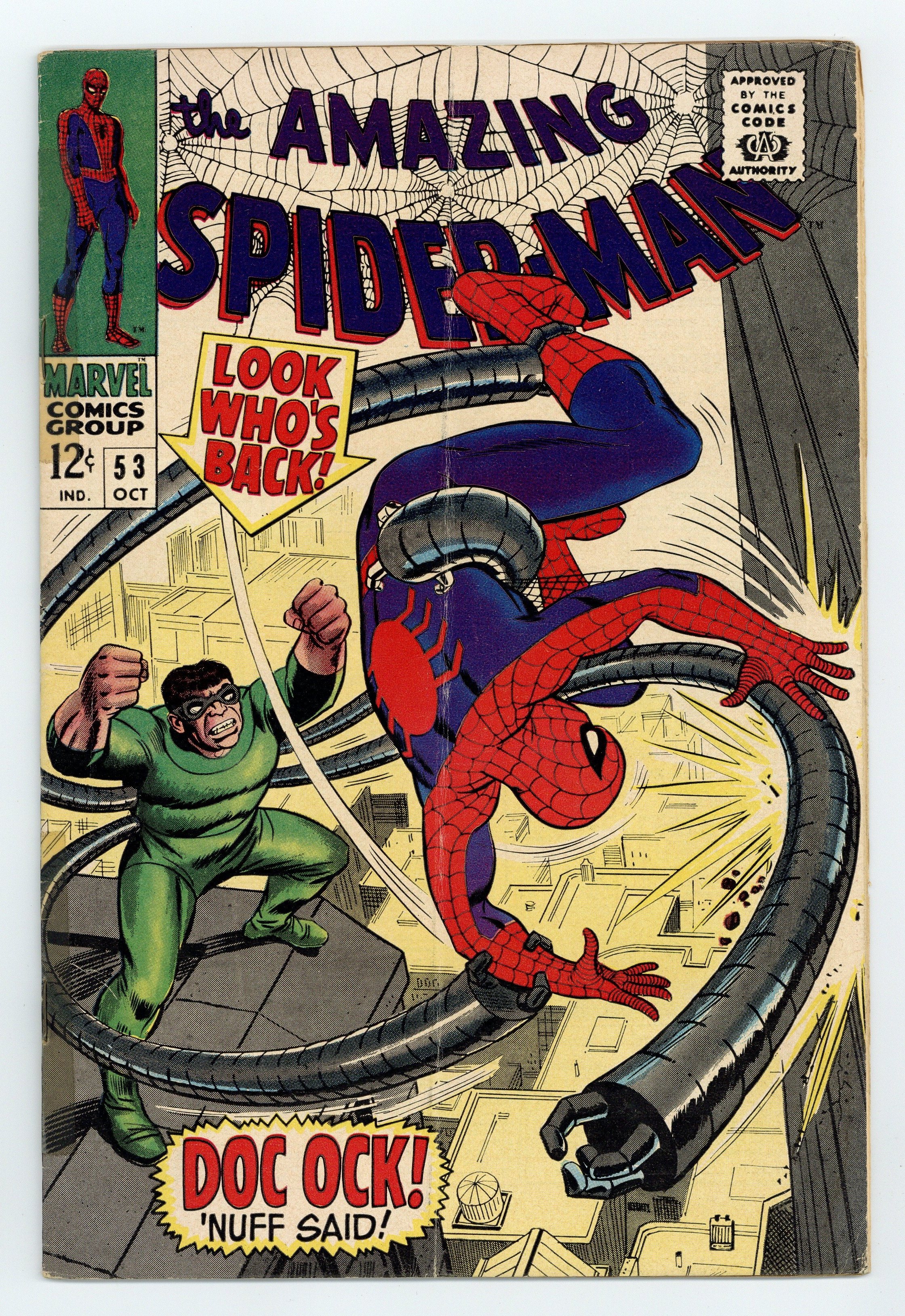 Doctor Octopus. Story synopsis: Peter and Gwen are off to the Science Expo with Professor Warren to see the "nullifier," but unfortunately Dr. Octopus is there too. Only he isn't there to listen to the lecture, he's there to steal it! After putting up a good fight, Spider-Man finally gets the nullifier back, but not before slipping a spider tracer on Doc Ock. Doc Ock finds the tracer when he gets back to his lab and decides to set up a trap for Spidey, but come on, Spidey isn't gonna fall for it. Aunt May and Anna Watson put an ad in the paper looking for a boarder at their house. And guess who answers the ad? That's right, the one and only Otto Octavius. "Enter Dr. Octopus." Script by Stan Lee, pencils by John Romita Sr., inks by Mike Esposito as "Mickey Demeo." Romita cover. Reprinted in Marvel Tales # 38. 36 pgs. Cover price $0.12.