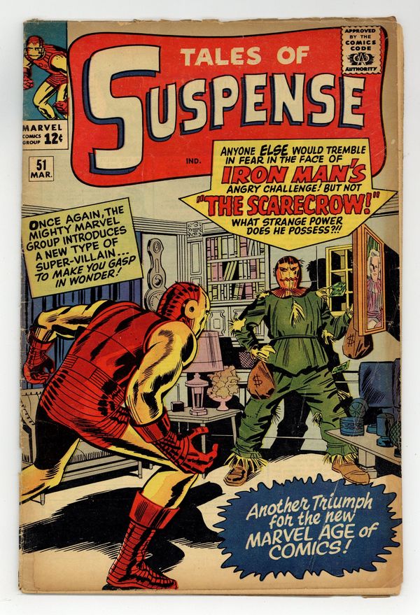 Cover pencils by Jack Kirby, inks by George Roussos. First appearance of the Scarecrow in "The Sinister Scarecrow!", script by Stan Lee, art by Don Heck; A contortionist becomes the Scarecrow and steals some plans from Tony Stark to sell them to Cuba; Iron Man follows the Scarecrow and steals back the plans. "The Recipe" text story. "The Green Thing!", script by Stan Lee (plot) and Larry Lieber (script), pencils by Larry Lieber, inks by Matt Fox; A psychic alien plant lands on Earth and torments a human to prove its power, but it is eaten by a crow. "The Primitive!", script by Stan Lee (plot) and Larry Lieber (script), pencils by Larry Lieber, inks by George Roussos (as G. Bell); A space explorer finally gives up his quest to find a more advanced species, not knowing that the primitives he found were more advanced, until they invented the cobalt bomb. 36 pgs., full color. $0.12. Cover price $0.12.