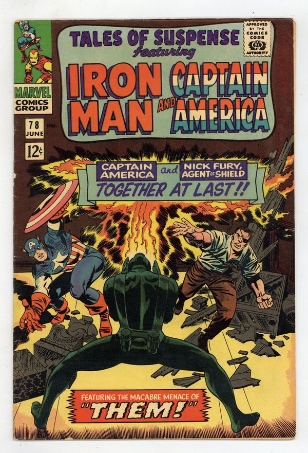 Cover pencils by Jack Kirby, inks by Frank Giacoia. "Crescendo!", script by Gene Colan (co-plot) and Stan Lee (co-plot, dialogue), pencils by Gene Colan, inks by Jack Abel (as Gary Michaels); Iron Man defeats Ultimo by tricking the monstrous android into setting off a long-dormant volcano; The Mandarin believes Tony Stark is dead, and vows Ultimo will live again; Shellhead steals a Commie jet and narrowly avoids getting shot down by US fighters. "Them!", script by Jack Kirby (plot) and Stan Lee (co-plot, dialogue), pencils by Jack Kirby, inks by Frank Giacoia; While Cap is in the middle of a training exercise involving flying "shock rollers," he's surprised to see Nick Fury turn up looking for info on a secret organization known only as "THEM"; As they talk, a strange flying craft lands outside Avengers Mansion, and a large, deadly "chemical android" attacks. 36 pages, full color. Cover price $0.12.