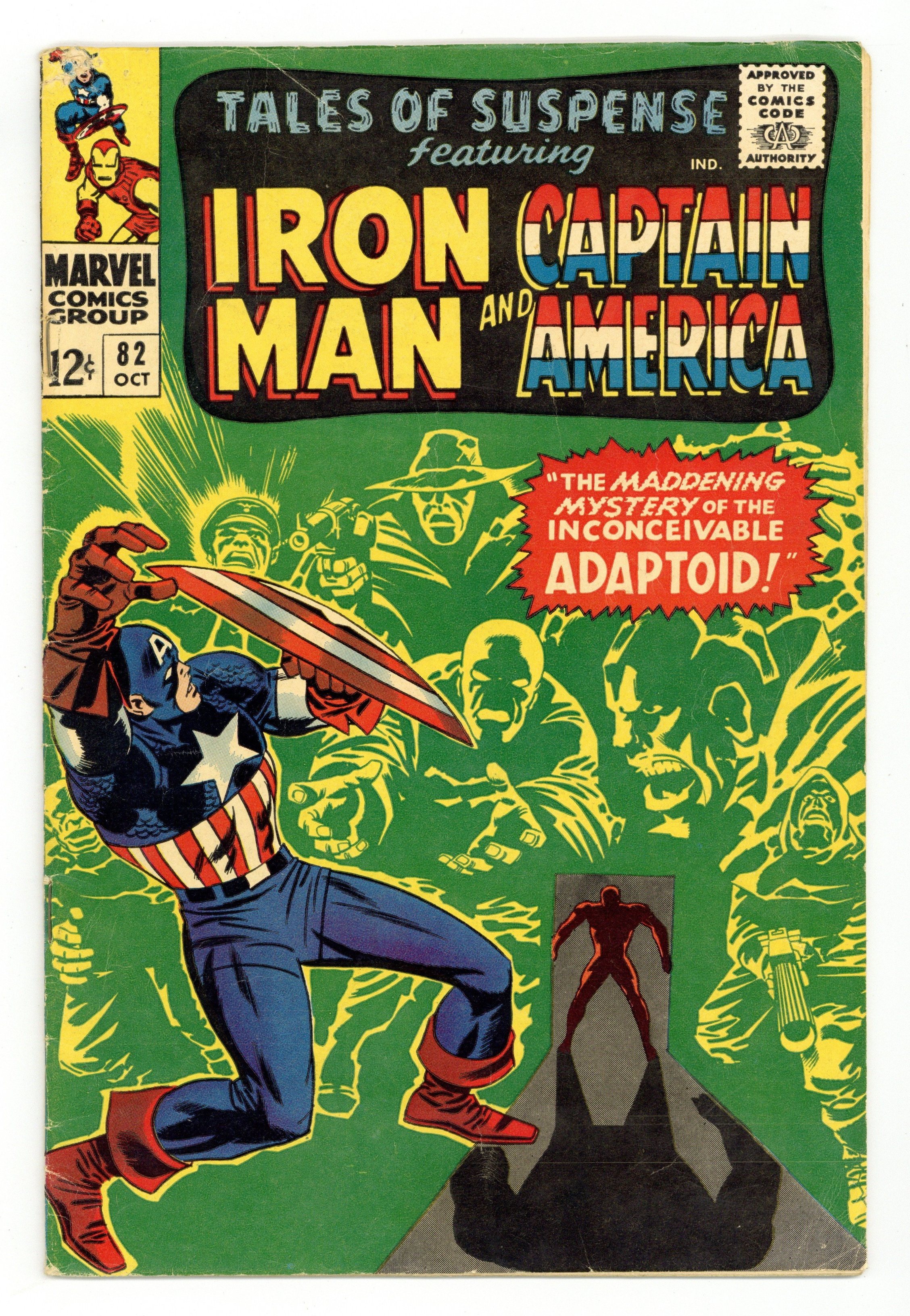 Tags: Marvel Legacy Numbering: Captain America (part 82), Marvel Legacy Numbering: Tales of Suspense (part 82), Captain America, Iron Man$16.00Cover pencils by Jack Kirby, inks by Frank Giacoia. "By Force of Arms!", script by Stan Lee, pencils by Gene Colan, inks by Frank Giacoia; Tony Stark flies into Washington D.C. to present himself to the hearing in his Iron Man armor, however on the way he is attacked by the newly revived Titanium Man who was launched into Washington D.C. by the Soviets. "The Maddening Mystery of the Inconceivable Adaptoid!", script by Stan Lee, pencils by Jack Kirby, inks by Frank Giacoia; The Adaptoid escapes from his AIM creators and invades Avengers Mansion to attack Captain America; Guest appearances by the Scarlet Witch, Quicksilver, and Bucky Barnes. Red Skull cameo; The story crosses over with a SHIELD story in Strange Tales #149. Ad for the Merry Marvel Marching Society. 36 pages, full color. NOTE: 1st appearance of Adaptoid. Cover price $0.12.