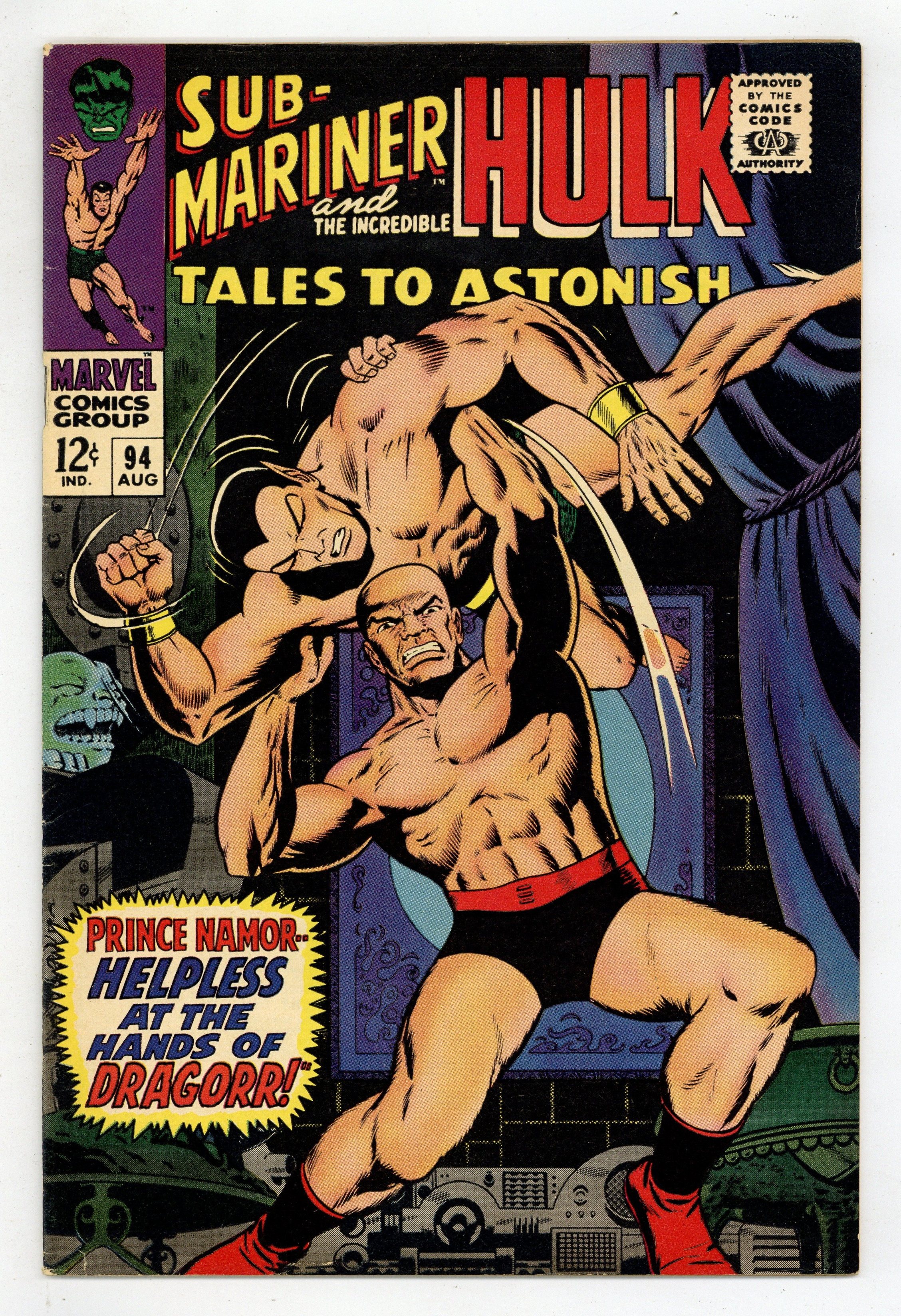 $15.00Cover by Dan Adkins. Helpless, at the Hands of Dragorr!, script by Roy Thomas, art by Bill Everett; As Namor plans his assault against the surface world, he is contacted by Dragorr, ruler of a small island, and invited to join him in conquering the world; Namor feels insulted by the surface man's affronity and decides to visit his island to teach him a lesson; Instead, he ends up being captured and forced to do Dragorr's bidding; It is only the timely intervention of the Lady Dorma that frees him and reveals the fact that Dragorr is a robot being run by the diminutive Gnome. To the Beckoning Stars!, script by Stan Lee, art by Marie Severin and Herb Trimpe; The High Evolutionary finds himself beseiged on the planet of Wundagore II as his New Men revert to their bestial natures and attack; Thinking the Hulk may be just the help he needs to face his out of control creations, the Evolutionary has him captured and transported to his world. 36 pgs., full color. $0.12. Cover price $0.12.