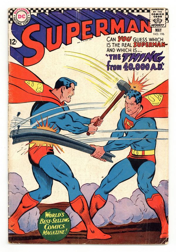 Tags: Superman$21.50Cover pencils by Curt Swan, inks by George Klein. The Thing From 40,000 A.D.!, script by Bill Finger, art by Wayne Boring; Superman battles a lookalike. The Star of Steel! starring Superman, Lyrica Lloyd, Marcus Moller, Perry White, Lois Lane, Jimmy Olsen, and Claude Keith, script by Otto Binder, art by Al Plastino. Letter to the editor from Irene Vartenoff. 36 Pages, Full Color. Cover price $0.12.