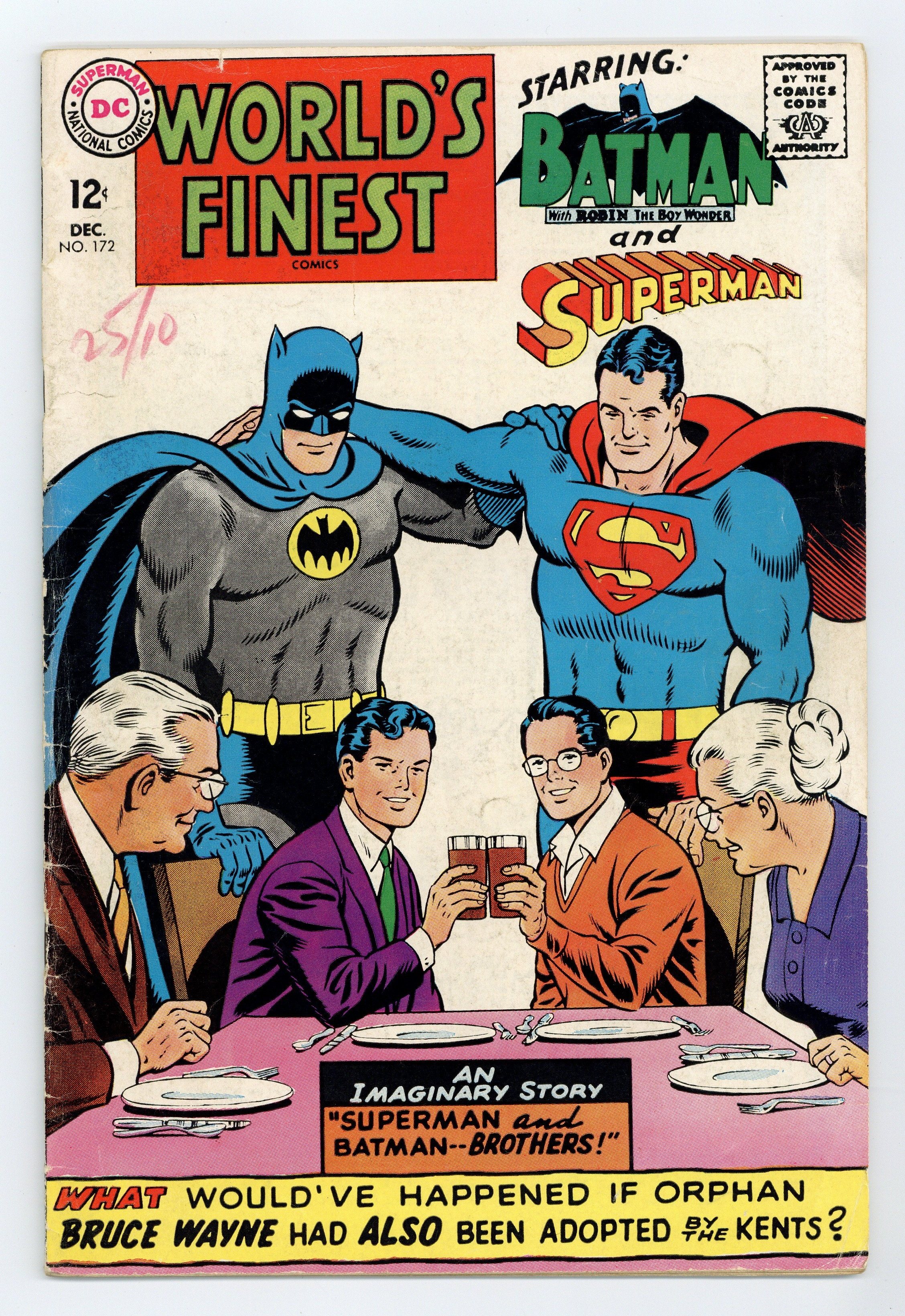 Tags: Superman$15.00Cover pencils by Curt Swan, inks by George Klein. Superman and Batman – Brothers, script by Jim Shooter, pencils by Curt Swan, inks by George Klein; The Kent's adopt Bruce Wayne when his parents are killed. Tank for Beach Green--Editors' Round Table: Our Fighting Forces, script by Bob Haney, art by Joe Kubert. 36 Pages, Full Color. Cover price $0.12.