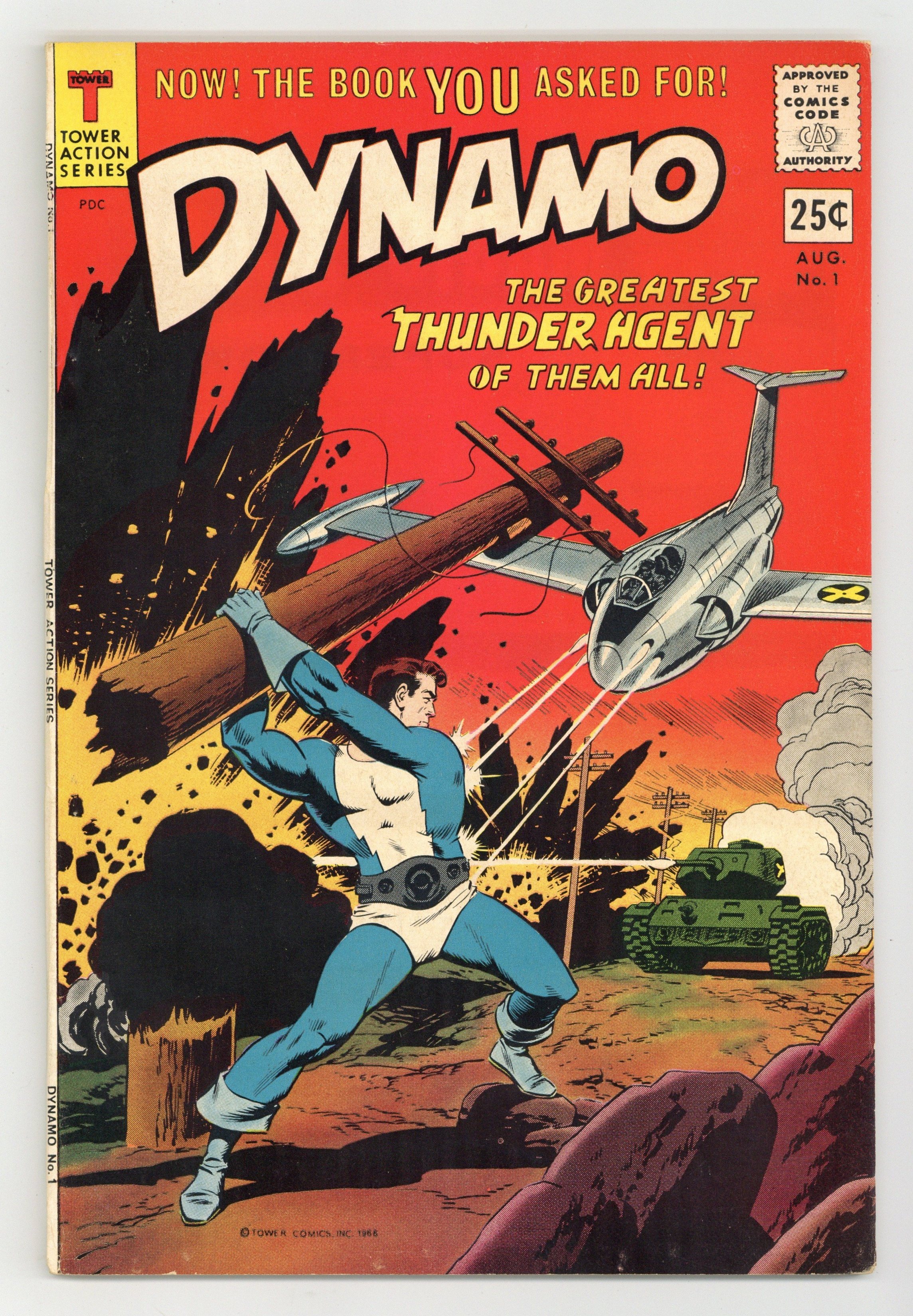 Published Aug 1966 by Tower Comics.$19.50Cover art by Wally Wood. "Menace from the Moon," art by Wally Wood; Observatories on Earth are being mysteriously destroyed; The President of the United States calls Noman and Dynamo in for a mission to investigate the suspected source of the destruction, a military base on the moon; Noman discovers a civilization living on the dark side of the moon. "A Day in the Life of Dynamo," script by Wally Wood and Tim Battersby, pencils by Mike Sekowsky, inks by Frank Giacoia; Len Brown plans on asking the Chief for a raise, but before he can get to it, adventure whisks him away; First to Hong Kong, where he is at the mercy of the Red Dragon, then to the subterranean world, where he must stop the Overlord's ambition of creating nuclear Armageddon on the surface world. "Back to the Stone Age," script by Tim Battersby, Wally Wood, and Dan Adkins, pencils by Reed Crandall, inks by Wally Wood; THUNDER makes the mistake of putting Demo in the same prison cell as Dr. Sparta; The two pool their resources, and are sprung from prison by Dr. Sparta's minion, Wilbur. "Dynamo Meets the Amazing Andor," pencils by Steve Ditko, inks by Wally Wood; The subterranean scientist Lord Uru reports on his latest project to overthrow the surface dwellers to the Overlord; His project involved raising an abandoned surface baby, and subjecting the child to treatments to control its mind and give it super-human strength. "Wonder Weed, Super Hero", art by John Giunta; Weed is an ordinary THUNDER agent with no special suit or powers, and he envies the others; Doctor Oom, a villainous master of telepathy and hypnotism, exploits Weed's envy by planting the hypnotic suggestion that he really has super-powers. 68 pgs., full color. Cover price $0.25.