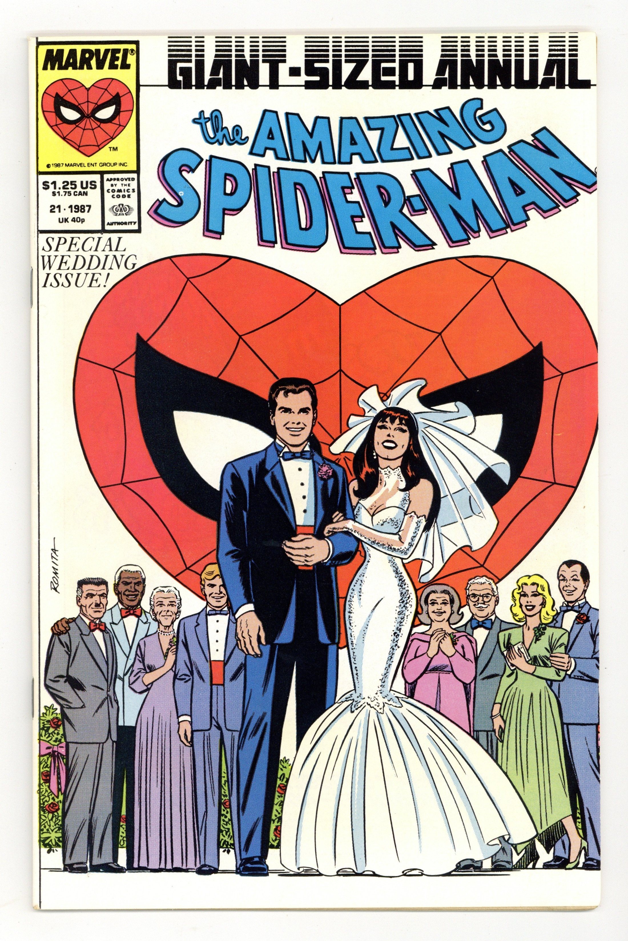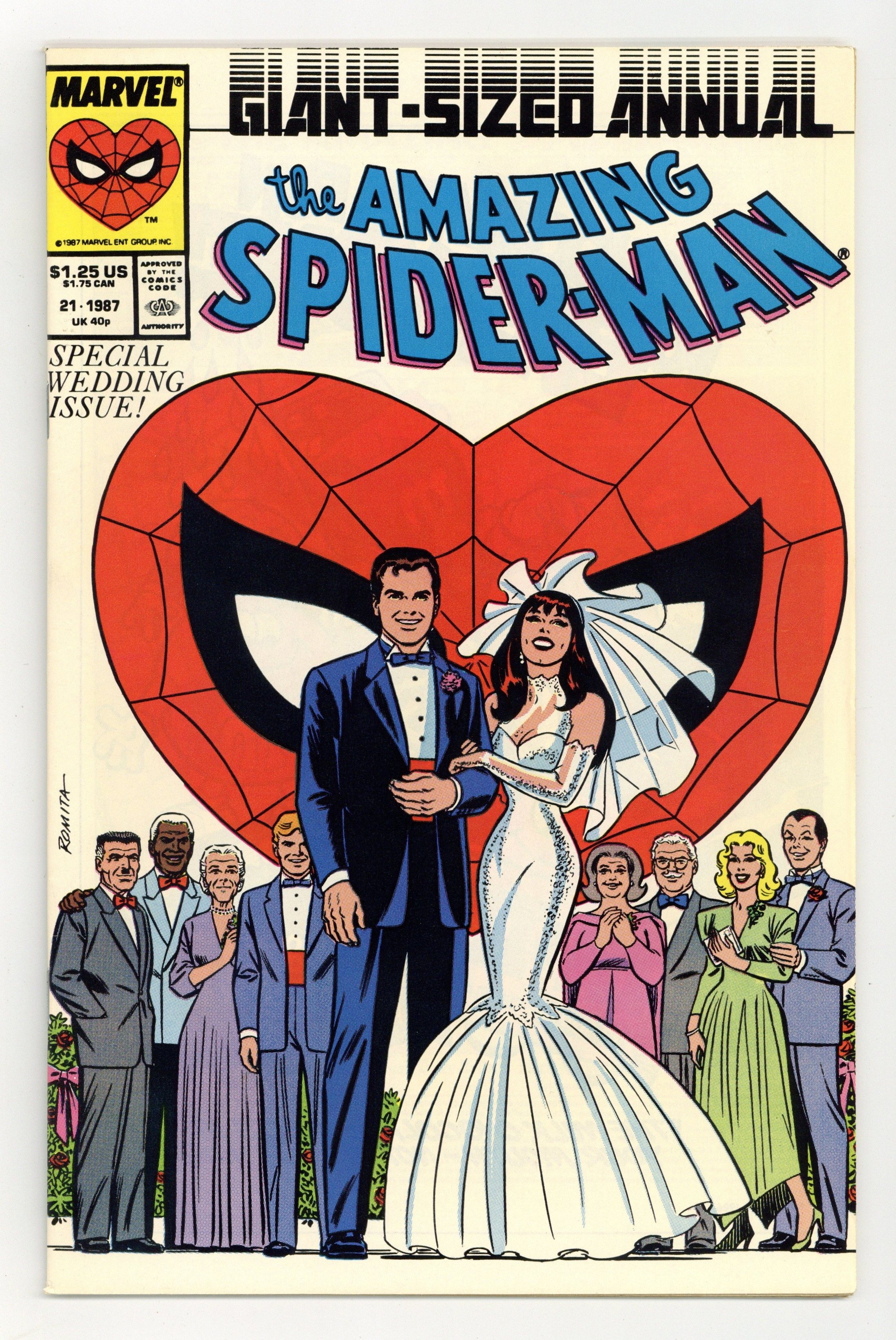 Direct Edition. The marriage of Peter Parker and Mary Jane Watson in "The Wedding." Plot by Jim Shooter. Script by David Michelinie. Pencils by Paul Ryan. Inks by Vince Colletta. Cover by John Romita Sr. Direct Edition. At long last wedding bells ring for Peter Parker and Mary Jane Watson! What an exciting day! The blushing bride will need something old, something new, something borrowed, and something blue! While the Amazing Spider-Man will need to take care of two things before the big day! First, the easy task...short circuit Electro's latest scheme! And second, the tough one...put the memory and heartache of Gwen Stacy in the past forever. Will another trip to the Brooklyn Bridge bring peace to the wondrous wall-crawler? Or will the ghosts of days gone by derail a bright future with Mary Jane? Carpe diem, web-slinger! Appearances by Flash Thompson, Harry Osborn, Liz Osborn, Betty Leeds, Aunt May, Anna Watson, Joe Robertson, J. Jonah Jameson, and Willi Smith. Flashback cameos by the Green Goblin, Gwen Stacy, and Uncle Ben. (Notes: Peter and Mary Jane go on their honeymoon in Spectacular Spider-Man Annual 7. The Direct Edition cover features Peter Parker's friends and family. The Newsstand Edition depicts Spider-Man's friends and foes. Amazing Spider-Man Annual 21 was one of the first issues Marvel published with two different covers. This story was reprinted in the 1991 trade paperback: the Amazing Spider-Man - The Wedding.) 52 pages. Cover price $1.25.