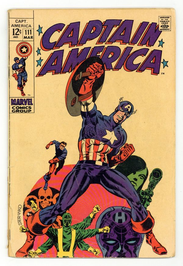 Cover by Jim Steranko. "Tomorrow You Live, Tonight I Die!", script by Jim Steranko (plot) and Stan Lee (dialogue), pencils by Jim Steranko, inks by Joe Sinnott; Cap is ambushed by HYDRA assassins at the command of Madame Hydra; The mission fails and later Rick Jones joins Cap in a training session; Alone, Rick picks up a message meant for Cap that causes him to hallucinate; Abducted by Hydra Cap searches for Rick and is attacked by a Hydra robot; Rick escapes & tries to warn Cap, who realizes he could make a good partner; Cap appears to leap from a rooftop into the river through a barrage of HYDRA gunfire; The police only find his costume and a mask with the facial features of Steve Rogers, suggesting "Rogers" was a fake identity; Bucky Barnes cameo. 36 pgs., full color. $0.12. Cover price $0.12.