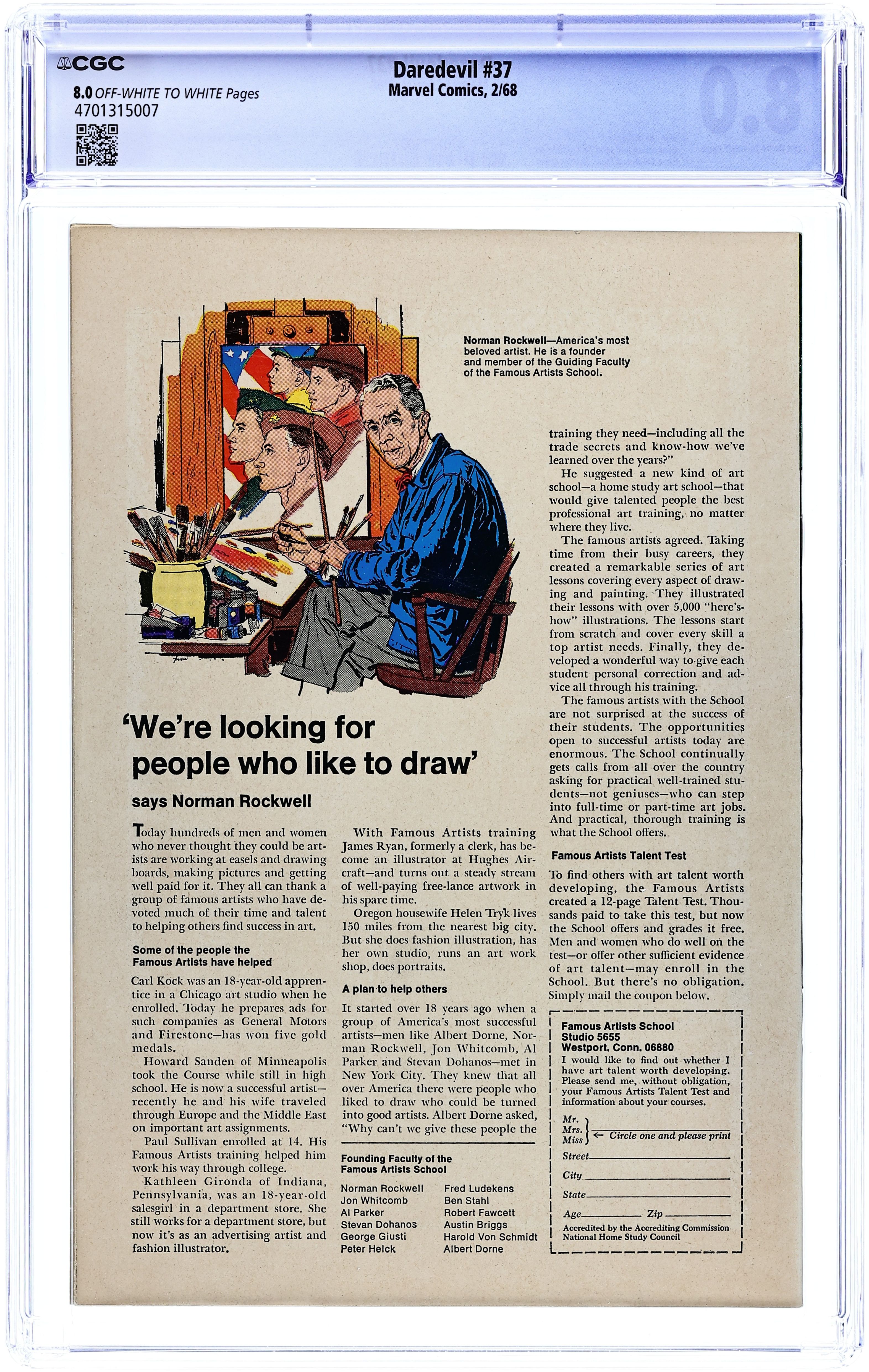 Ends Mar 30 7:55 PM CST Bid History 3 bids Current Bid $17 Your Secret Max Bid If you'd like to bid, please log in or register. Cover pencils by Gene Colan, inks by Frank Giacoia. Don't Look Now, But It's Dr. Doom, script by Stan Lee, pencils by Gene Colan, inks by John Tartaglione; Doom captures Daredevil and switches bodies with our hero; cameo flashback featuring Mr. Fantastic, Invisible Girl, Human Torch, and Galactus. 36 pgs. Cover price $0.12. Cover price $0.12.