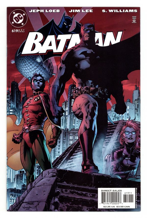 Red Background Variant.WRITTEN BY JEPH LOEB; ART AND COVERS BY JIM LEE AND SCOTT WILLIAMS In stores September 24. The pulse-pounding conclusion to the 12-part "Hush" story arc that has thrilled critics and fans alike, featuring two astounding variant triple-gatefold covers! Who is Hush? Why has this mysterious figure plagued Batman? All the secrets are revealed, and one thing is for sure: Nothing will ever be the same for the Dark Knight! The two triple-paneled gatefold covers feature Batman and his allies on one, and all the major Bat-villains on the other, showcasing Jim Lee's incredible vision of the dark world of Batman. For more information, see the feature article. 36 Pages, Full Color. Cover price $2.25.