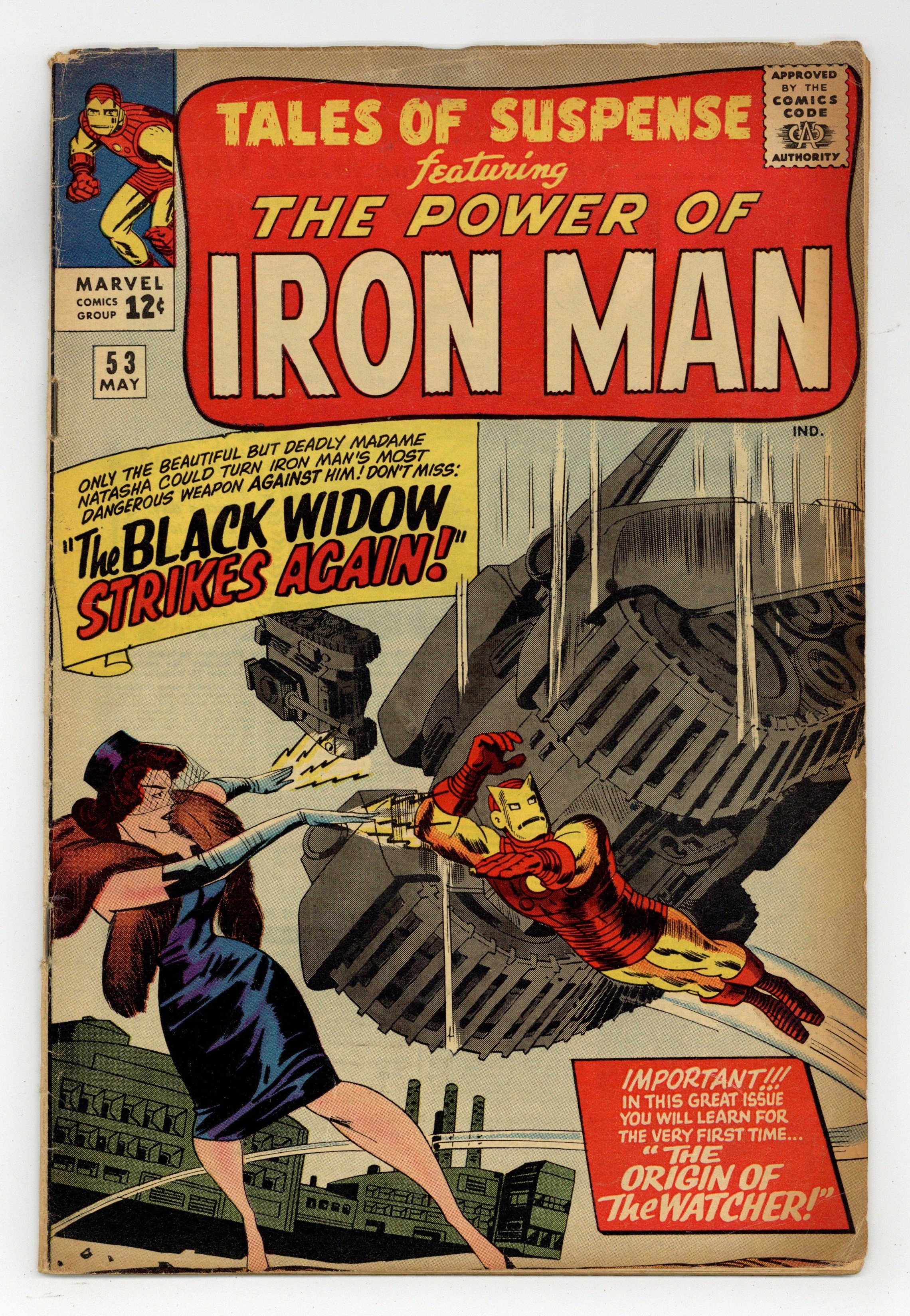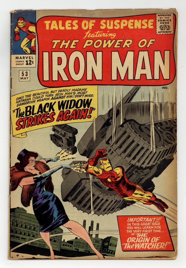 Starts Apr 4 Cover pencils by Jack Kirby, inks by Sol Brodsky. Second appearance of the Black Widow in "The Black Widow Strikes Again!", script by Stan Lee (plot) and Don Rico (as N. Korok), art by Don Heck; To redeem herself in the eyes of the communist leader, Black Widow steals the new anti-grav ray device developed by Tony Stark and attacks Fort Knox; Iron Man destroys the ray device, but the Black Widow escapes. "The Magician" text story. "The Omen," script by Stan Lee (plot) and Larry Lieber (script), pencils by Larry Lieber, inks by George Roussos (as George Bell); A superstitious warlord thinks a flare of light is a good omen for an invasion, but when it is discovered to be a meteor his entire world must evacuate in order to survive. The Watcher origin in the fifth Tales of the Watcher, "The Way It Began," script by Stan Lee (plot) and Larry Lieber (script), pencils by Larry Lieber, inks by Paul Reinman; The Watcher comes from a super-advanced race that decides to share its technology with others; When their first attempt ends in tragedy, they vow never to interfere with the affairs of less advanced species. The second half of "The Magician" (text story). 36 pages, full color. Cover price $0.12.