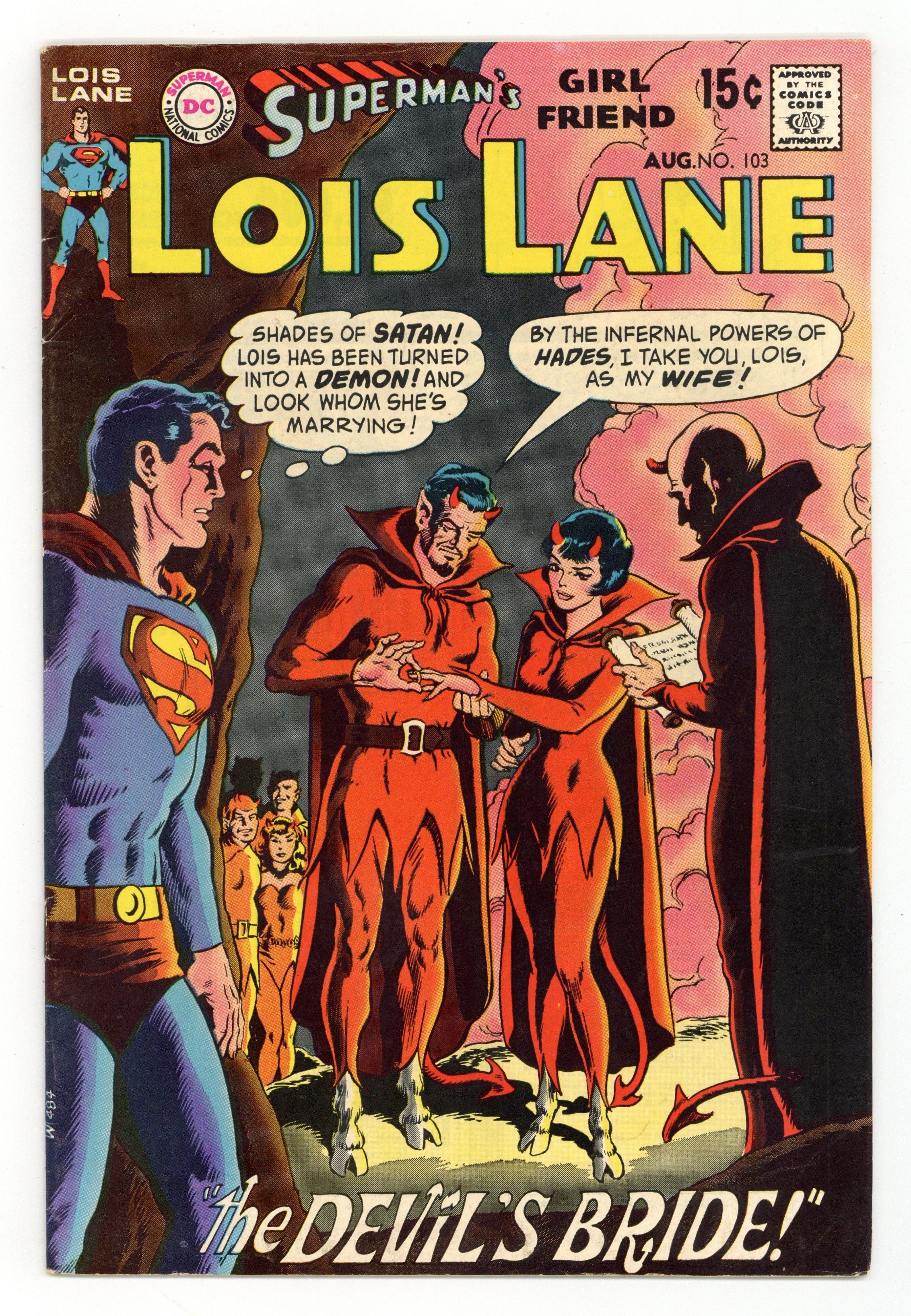 Cover pencils by Curt Swan, inks by Murphy Anderson. The Devil's Bride!, script by Robert Kanigher, pencils by Curt Swan, inks by Mike Esposito; Satdev reveals that Lois is not dead after all, and that he is an alien from the planet Nferino; story continued from previous issue. The Fantastic Wigs of Mr. Dupre!, art by Kurt Schaffenberger; Lois uncovers a criminal gang using a wig shop as a front, thanks to Supergirl's help. House ad for Superman #229. 36 Pages, Full Color. Cover price $0.15.