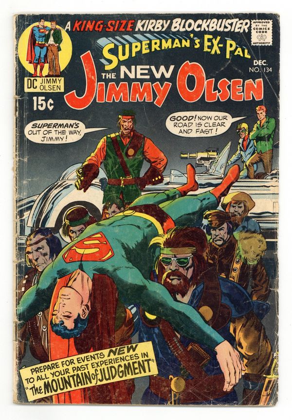 1st appearance of Darkseid (cameo). Cover art by Neal Adams. The Mountain of Judgement!, script by Jack Kirby, pencils by Jack Kirby and Al Plastino (some Superman heads), inks by Vince Colletta; Superman defuses a bomb that was intended to destroy the Hairies, Jimmy, and the Newsboys. The Whiz Wagons Are Coming!, script by Jack Kirby, pencils by Jack Kirby, inks by Vince Colletta. 36 Pages, Full Color. Cover price $0.15.