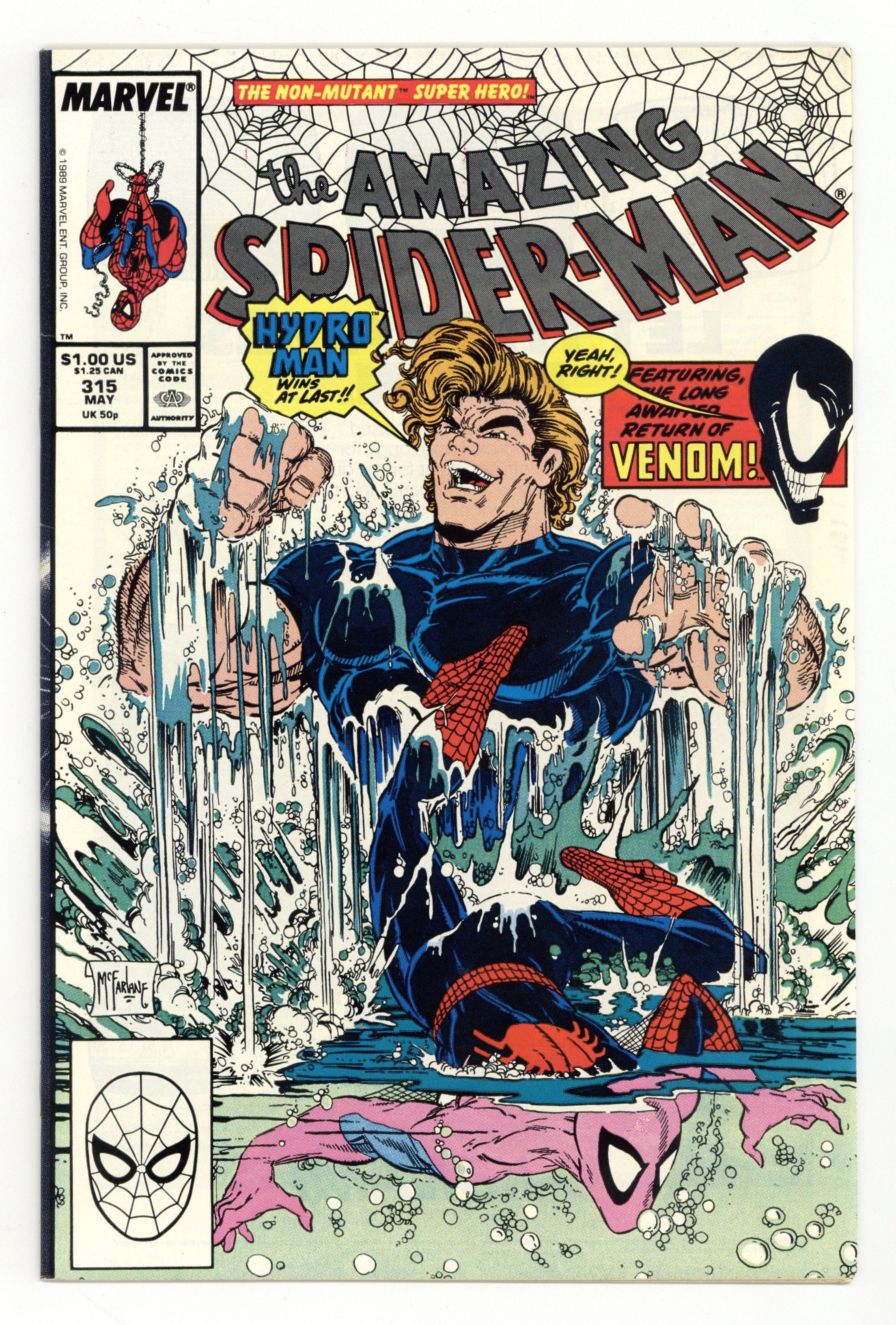 Tags: Marvel Legacy Numbering: Amazing Spider-Man (part 315), Print Run Statistics$46.50Direct Edition. "A Matter of Life and Debt!" Script by David Michelinie. Art by Todd McFarlane. Cover by Todd McFarlane. Life is full of challenges and on this day Peter Parker and his web-spinning alter-ego face three! The first, Hydro-Man attempts a payday robbery! But the Spectacular Spider-Man stops the heist! The second, Nathan Lubensky steals money from Aunt May to pay his gambling debts! However, Peter quickly shuts down his operation! And the fateful third...Venom escapes from the Vault! Wow, this challenge will be more difficult and more deadly starting next issue! Cameo appearances by Mary Jane Watson and Kristy Watson. (Notes: Venom previously appeared in Amazing Spider-Man 300.) The letters page contains a statement of ownership: average print run 451,930; average paid circulation 271,100. 36 pgs. Cover price $1.00.