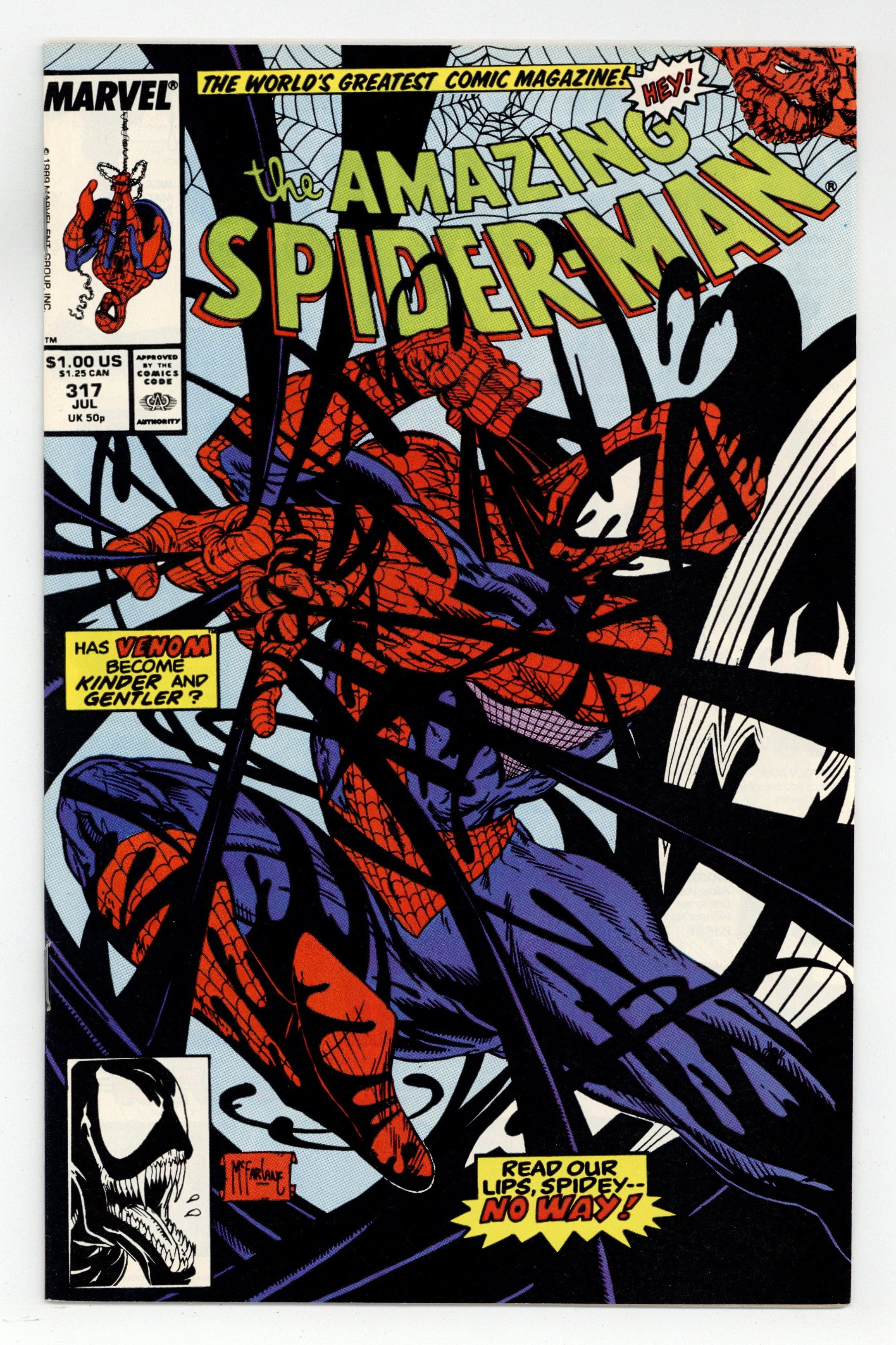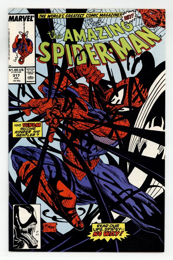 Starts Apr 20 Direct Edition. "The Sand and the Fury!" Part 2 of 2. Script by David Michelinie. Art by Todd McFarlane. Cover by Todd McFarlane. After fleeing from Venom last issue, the web-slinger returns to the sanctuary of Aunt May's home in Queens! Peter and Mary Jane have only been living there for a few days and haven't had any visitors. But suddenly their first one knocks on the door: Venom! What?! Is the crazed villain going to slay Aunt May and her elderly boarders? No, the savage psychopath just stopped by to issue a challenge to her wall-crawling nephew! Meet in the morning at Montauk Point off Long Island Sound for a duel to the death! Wow, does the web-slinger have a chance vs. the overpowering Venom? The situation does not look good for your friendly neighborhood Spider-Man. Cameo appearance by the Thing (aka Ben Grimm). (Notes: Venom appears next in the Avengers' graphic novel: Death Trap The Vault. Venom returns to torment the web-slinger again in Amazing Spider-Man 332 & 333.) 36 pages. Cover price $1.00.