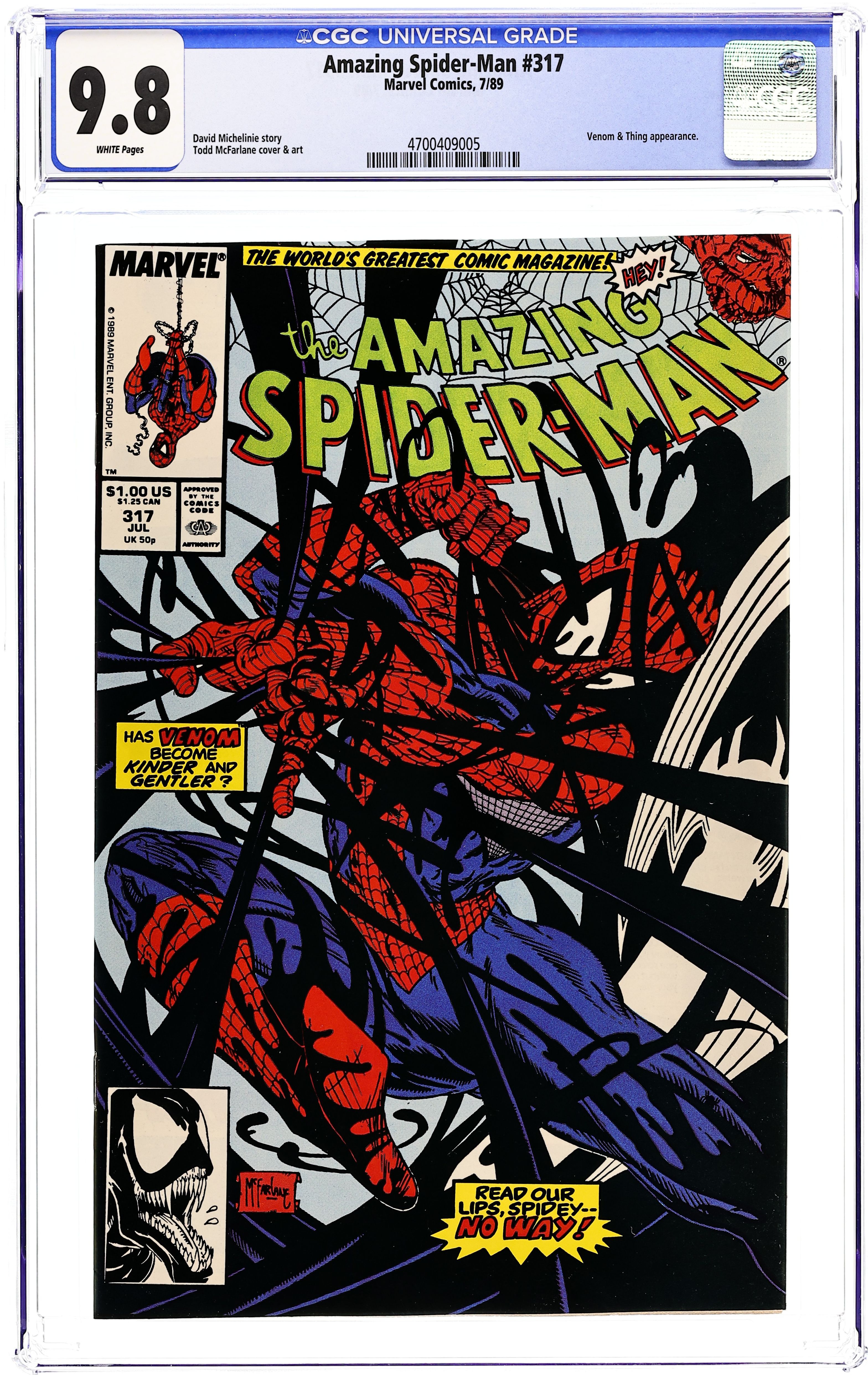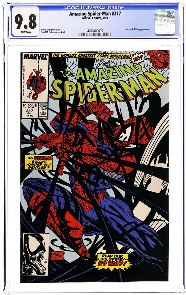 Ends Mar 30 7:15 PM CST Bid History 6 bids Current Bid $21 Your Secret Max Bid If you'd like to bid, please log in or register. Direct Edition. "The Sand and the Fury!" Part 2 of 2. Script by David Michelinie. Art by Todd McFarlane. Cover by Todd McFarlane. After fleeing from Venom last issue, the web-slinger returns to the sanctuary of Aunt May's home in Queens! Peter and Mary Jane have only been living there for a few days and haven't had any visitors. But suddenly their first one knocks on the door: Venom! What?! Is the crazed villain going to slay Aunt May and her elderly boarders? No, the savage psychopath just stopped by to issue a challenge to her wall-crawling nephew! Meet in the morning at Montauk Point off Long Island Sound for a duel to the death! Wow, does the web-slinger have a chance vs. the overpowering Venom? The situation does not look good for your friendly neighborhood Spider-Man. Cameo appearance by the Thing (aka Ben Grimm). (Notes: Venom appears next in the Avengers' graphic novel: Death Trap The Vault. Venom returns to torment the web-slinger again in Amazing Spider-Man 332 & 333.) 36 pages. Cover price $1.00.