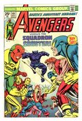 "The Phantom Empire!" Part 1 of 7. Script by Steve Englehart. Pencils by George Perez (first work on the Avengers). Inks by Vince Colletta. Cover by Gil Kane and John Romita. A landmark issue of the Avengers with one of the best covers of the bronze age! Also the first issue of the last great saga of the Steve Englehart era that sends one half of Earth's Mightiest Heroes to another world...and the other half to another time! And featuring George Perez's first artwork on the Avengers title. Now to the story...Captain America returns to Avengers Mansion seeking help in his ongoing struggle against the Brand Corporation and Roxxon Oil. However, the Avengers already have a crisis on their hands with the confirmation of Hawkeye's disappearance...and the high probability of Kang the Conqueror's involvement! So Thor and Moondragon summon Immortus to assist them in traveling back in time; while the remaining Avengers and Patsy Walker invade the Brand Corporation's Long Island facility expecting to fight a small private army...not the Squadron Supreme! Cameo appearances by the Wasp and Yellowjacket. Flashback cameos by the Falcon, Nomad, and the Red Skull to recap Cap's recent encounter with the Serpent Crown. (Notes: George Perez paid homage to Gil Kane's classic cover with his cover to Avengers (3rd series) 6. The cover should read the Avengers vs. the Squadron Supreme Instead of the Squadron Sinister. The Squadron Supreme previously appeared in Avengers 86.) 36 pgs. Cover price $0.25.