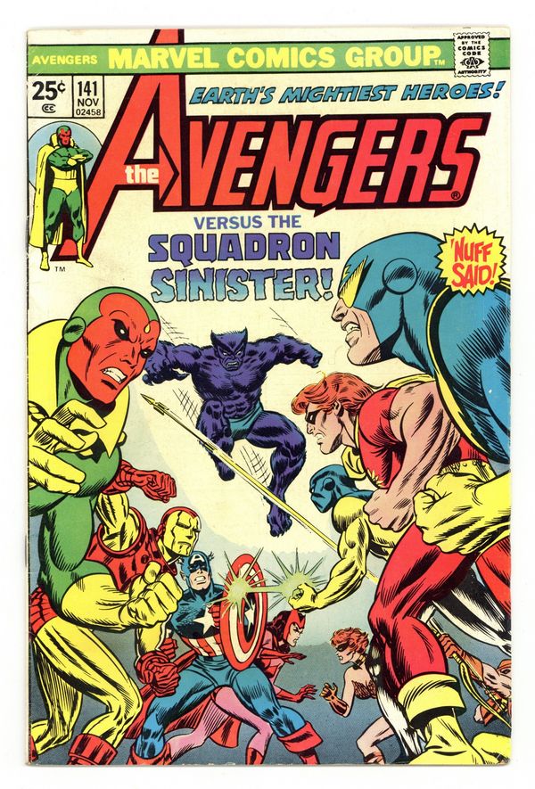 Tags: Marvel Legacy Numbering: Avengers (part 141), Avengers$29.50"The Phantom Empire!" Part 1 of 7. Script by Steve Englehart. Pencils by George Perez (first work on the Avengers). Inks by Vince Colletta. Cover by Gil Kane and John Romita. A landmark issue of the Avengers with one of the best covers of the bronze age! Also the first issue of the last great saga of the Steve Englehart era that sends one half of Earth's Mightiest Heroes to another world...and the other half to another time! And featuring George Perez's first artwork on the Avengers title. Now to the story...Captain America returns to Avengers Mansion seeking help in his ongoing struggle against the Brand Corporation and Roxxon Oil. However, the Avengers already have a crisis on their hands with the confirmation of Hawkeye's disappearance...and the high probability of Kang the Conqueror's involvement! So Thor and Moondragon summon Immortus to assist them in traveling back in time; while the remaining Avengers and Patsy Walker invade the Brand Corporation's Long Island facility expecting to fight a small private army...not the Squadron Supreme! Cameo appearances by the Wasp and Yellowjacket. Flashback cameos by the Falcon, Nomad, and the Red Skull to recap Cap's recent encounter with the Serpent Crown. (Notes: George Perez paid homage to Gil Kane's classic cover with his cover to Avengers (3rd series) 6. The cover should read the Avengers vs. the Squadron Supreme Instead of the Squadron Sinister. The Squadron Supreme previously appeared in Avengers 86.) 36 pgs. Cover price $0.25.