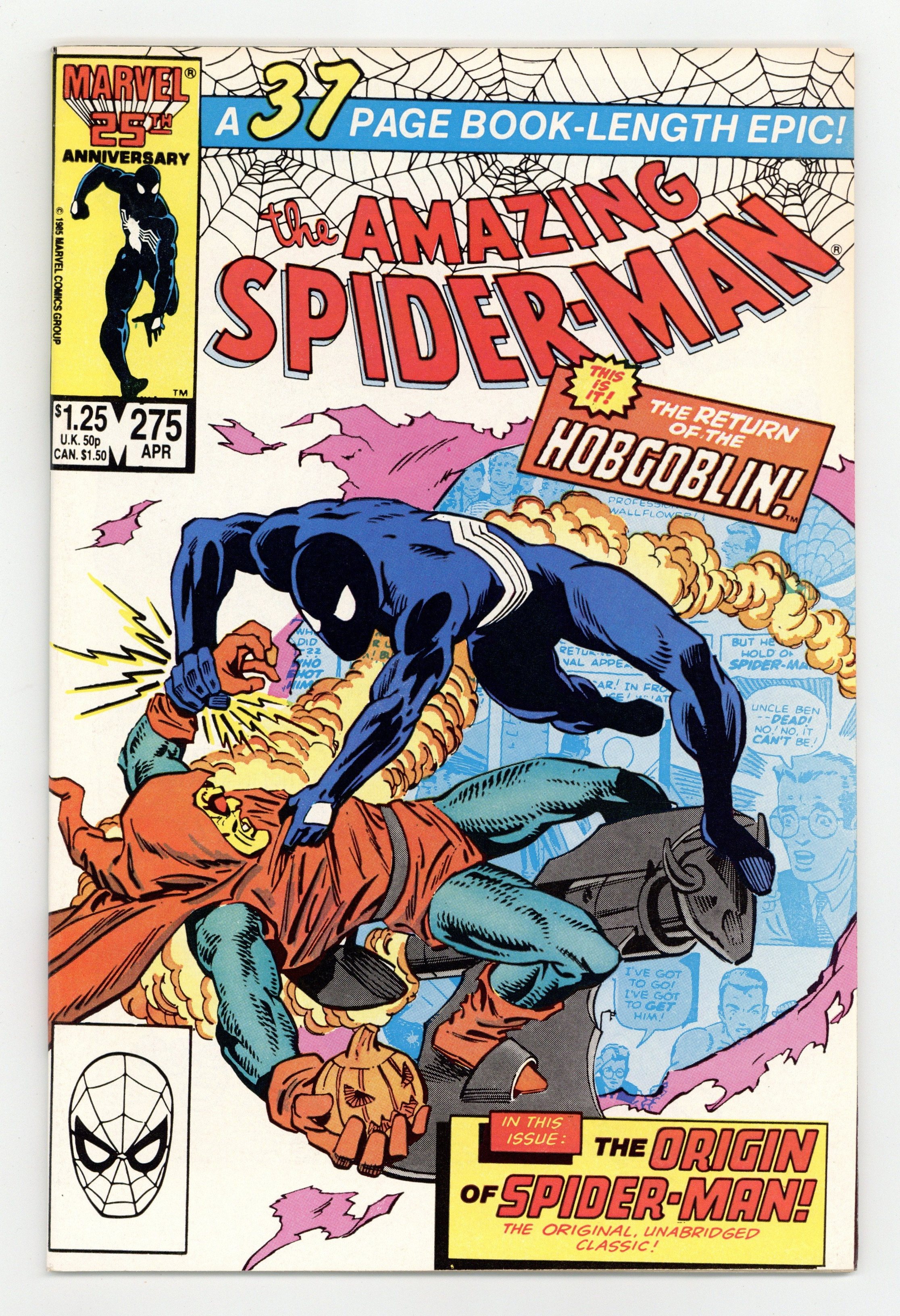 Tags: Marvel Legacy Numbering: Amazing Spider-Man (part 275), Spider-Man$13.50Direct Edition. "The Choice and the Challenge!" Part 1 of 2. Double-sized issue. Script by Tom DeFalco. Pencils by Ron Frenz. Inks by Joe Rubinstein. Cover by Ron Frenz and Joe Rubinstein. Affairs of the heart take center stage for Peter, Mary Jane, Betty, Ned, Flash, and Sha Shan as the long-time group of friends deal with a variety of relationship problems! But amid the soap opera-style drama, there is a super-villain on the prowl...the Hobgoblin! Armed with a new weapons system, the goblin circles the Port Authority Bus Terminal to draw out the web-slinger! Surprisingly the Hobgoblin's plan works! And then so does his new weapon! Is the goblin finally going to put Spidey down for the count? Cameo appearances by the Kingpin, Arranger, and Rose. Flashback cameos by the Green Goblin, Gwen Stacy, and the Sin-Eater. (Notes: Woven into the story are 11 (reprinted) pages of Spider-Man's origin from Amazing Fantasy 15. Script by Stan Lee. Art by Steve Ditko. On the cover the web-slinger and Hobgoblin break through a page from Amazing Fantasy 15. This issue was reprinted in Marvel Tales 283.)52 pgs. Cover price $1.25.