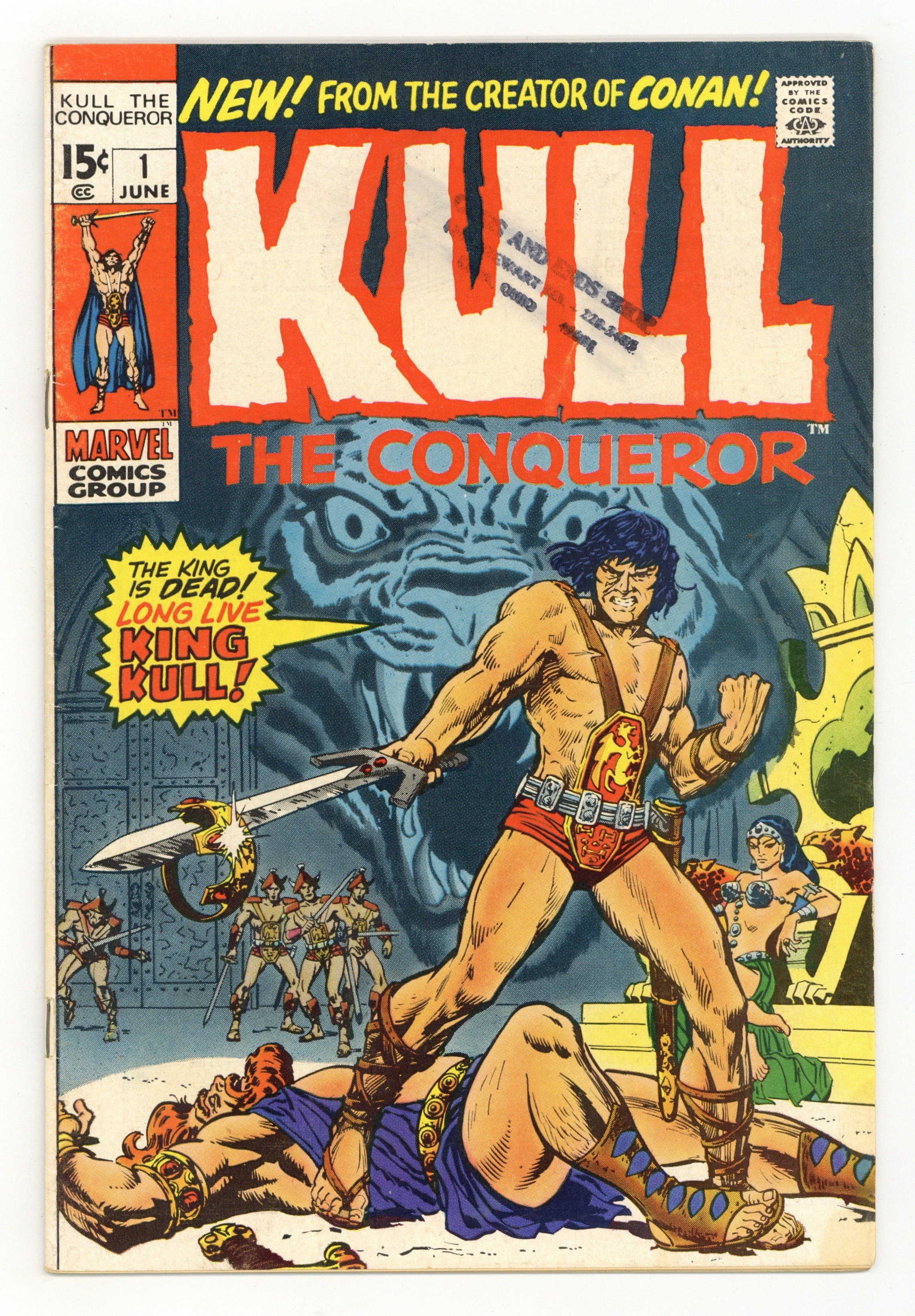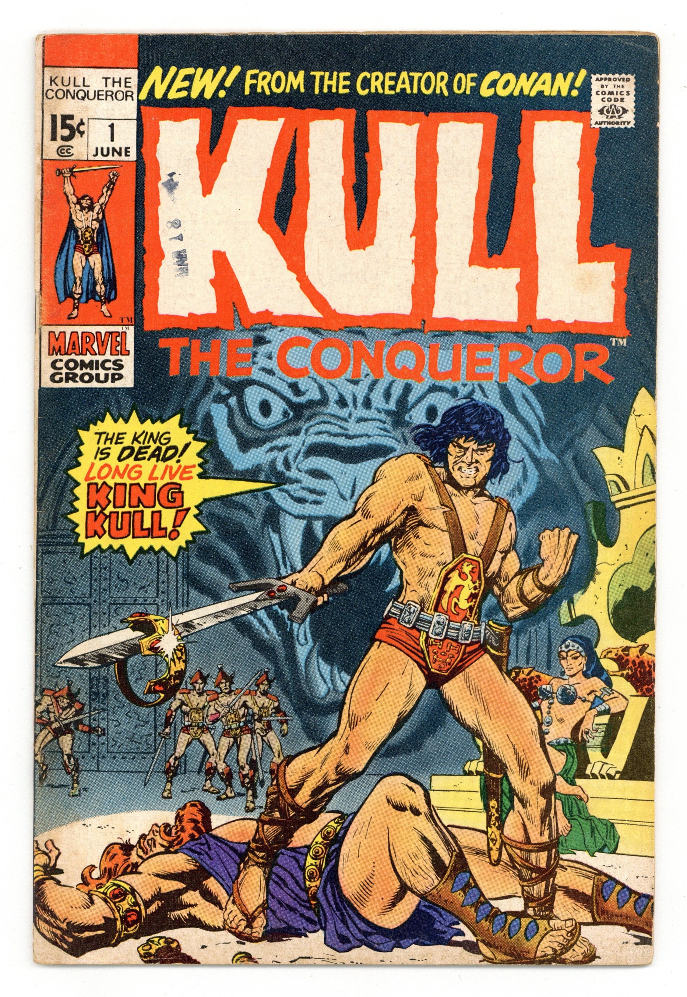 First full comic book appearance of Kull (he has a cameo in Conan the Barbarian 1 and a 7-page story in Creatures on the Loose 10). "A King Comes Riding." Script by Roy Thomas, pencils by Ross Andru, inks by Wally Wood. First appearance of Brule the Spear-Slayer. Adapted in part from "The Shadow Kingdom," "By This Axe I Rule," and "Exile of Atlantis" (Kull stories by creator Robert E. Howard). Cover pencils by Ross Andru and Sal Buscema; cover inks by Marie Severin. Cover price $0.15.