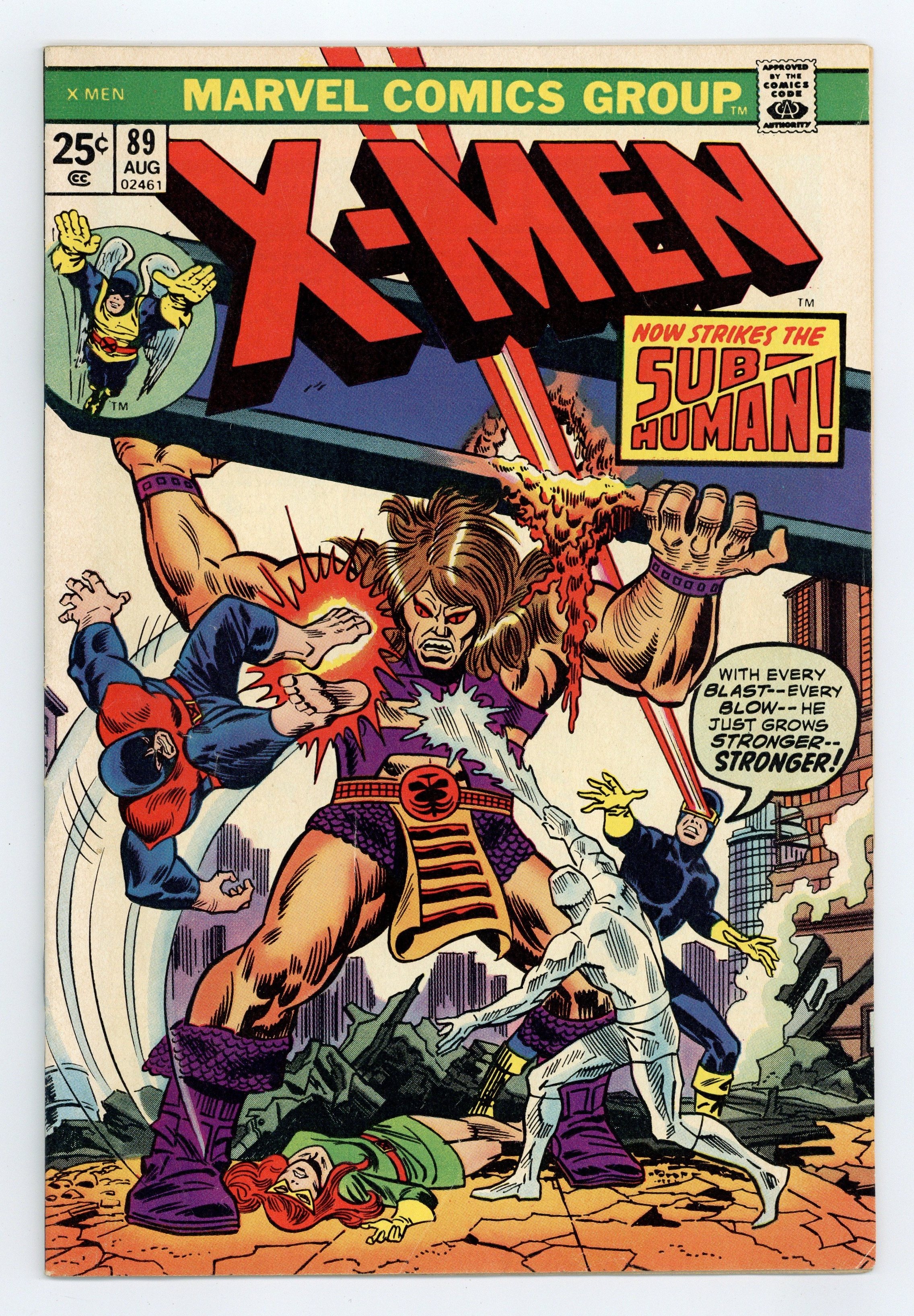 Cover inks by Frank Giacoia. Now Strikes the Sub-Human, script by Roy Thomas, pencils by Don Heck, inks by George Tuska; the X-Men battle the Grotesk, the last survivor of the Sub-Humans; reprinted from issue 41. For the Rest of Your Life!, script by Stan Lee, art by Steve Ditko; Jupiter's courts are thought soft, but their convicts are actually imprisoned for life within an illusion of freedom; reprinted from Amazing Adult Fantasy #11. 36 pgs. $0.25. Cover price $0.25.