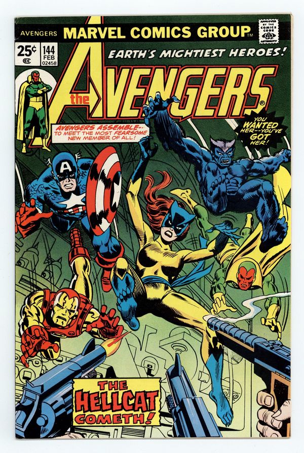 "Claws!" Part 4 of 7. First appearance of Hellcat. Script by Steve Englehart. Pencils by George Perez. Inks by Mike Esposito. Cover by Gil Kane and Frank Giacoia. The Avengers are free inside the Brand Corporation's Long Island facility! However, it doesn't take long for Hugh Jones and Buzz Baxter to locate them and activate the plant's internal military-grade weapons! During the missile attack, the Avengers are forced to split up. The Beast, Vision, and Scarlet Witch go one way...and Captain America, Iron Man, and Patsy Walker go another! When Shell-head comes across the former uniform of the Cat, the shield-slinger gets an idea! And in a dazzling transformation...Patsy Walker becomes Hellcat! The Avengers could use another hero on their side, because the rematch with Doctor Spectrum, the Golden Archer, Hyperion, Lady Lark, and the Whizzer is coming up fast! An excellent issue! The story (part 5) continues in Avengers 147. Origin of Patsy Walker. Cameo appearances by the Two-Gun Kid, Hawkeye, Moondragon, and Thor. Flashback cameos by the Fantastic Four, Spider-Man, and Tigra. (Notes: The letters page includes letters from comics writer Peter Gillis and comics writer Mary Jo Duffy, respectively. The letters page also contains Marvel Value Stamp Series B #39 Thor by Jack Kirby.) 36 pgs. Cover price $0.25.