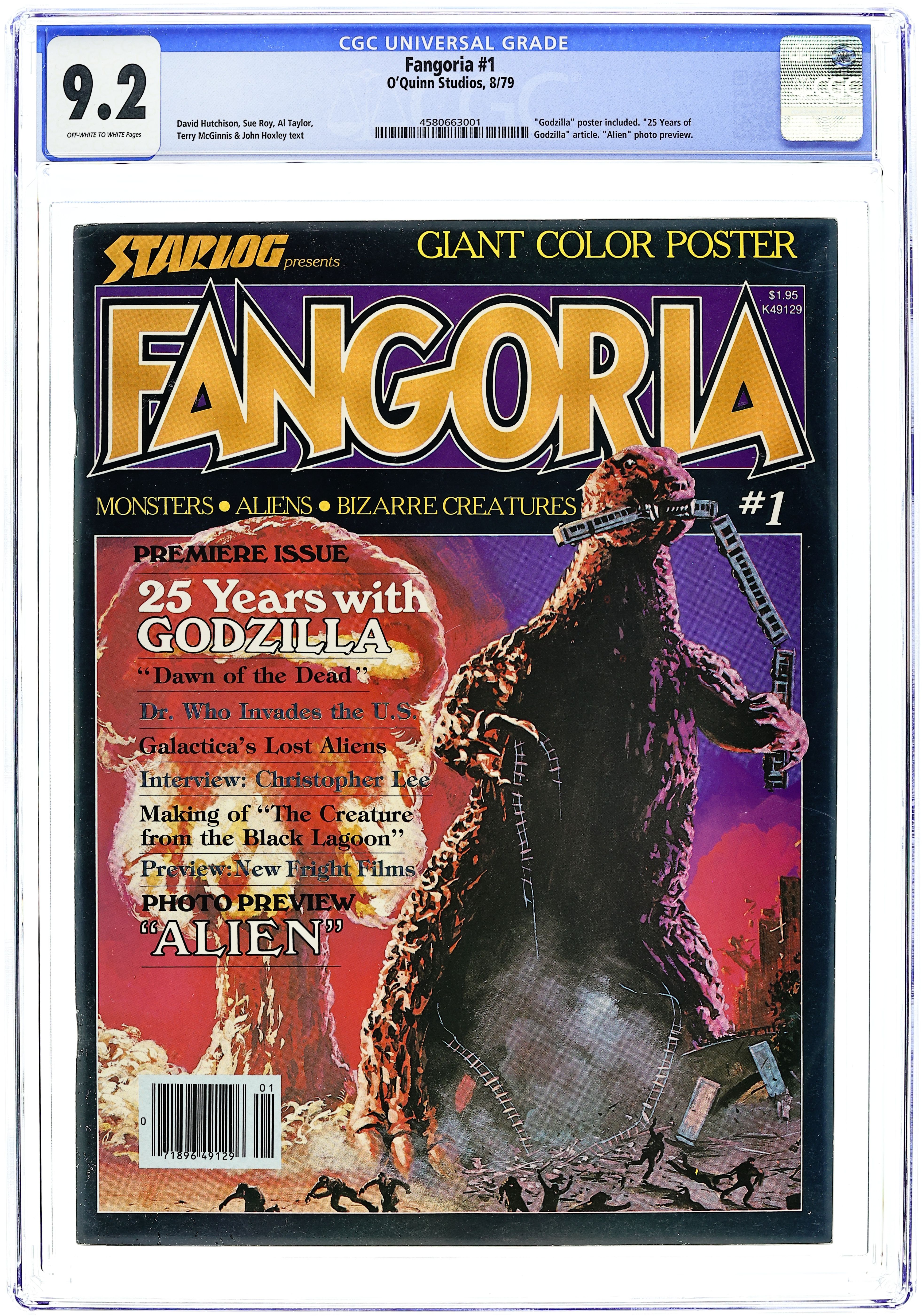 Includes Foldout Godzilla Poster - The horror equivalent of sci-fi sister publication Starlog, Fangoria is devoted to "monsters, aliens and bizarre creatures" and is touted by its publisher to be the "first classy, professional, pictorial news magazine covering the world of fantasy." Issue #1 includes: a welcome letter from publisher Kerry O'Quinn; articles about Dr. Who and The Amityville Horror; a feature on Battlestar Galactica's lost aliens; a foldout Godzilla poster; "Twenty-five Years with Godzilla"; Tom Savini revealing his makeup techniques; a photo preview of Alien; a behind-the-scenes look at The Creature from the Black Lagoon; an interview with Christopher Lee; and more. Godzilla featured on the cover. Cover price $1.95.