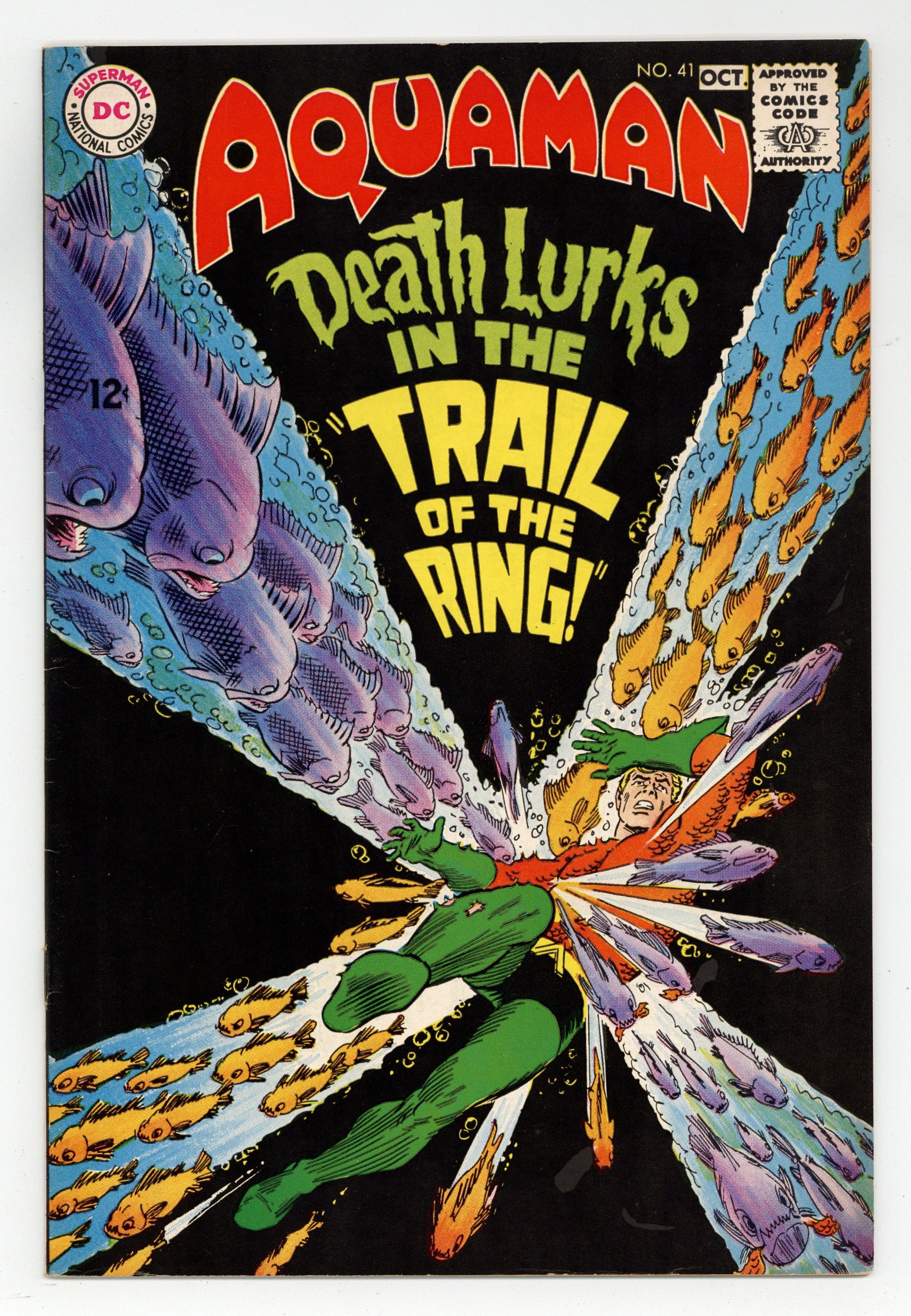 $24.50Cover art by Nick Cardy. The Trail of the Ring! starring Aquaman, Aqualad, Aquagirl, Aquababy, Mera (flashback), Vulko, Harkran, and Zancol, script by Steve Skeates, art by Jim Aparo; Aquaman continues his quest to find the missing Mera. Letter from comics writer Tony Isabella. House ad for Superman's Girl Friend Lois Lane #86 (October 1968), written as a wedding invitation, art by Neal Adams. House ad for non-specific next issue of House of Mystery. 36 pgs. $0.12. Cover price $0.12.
