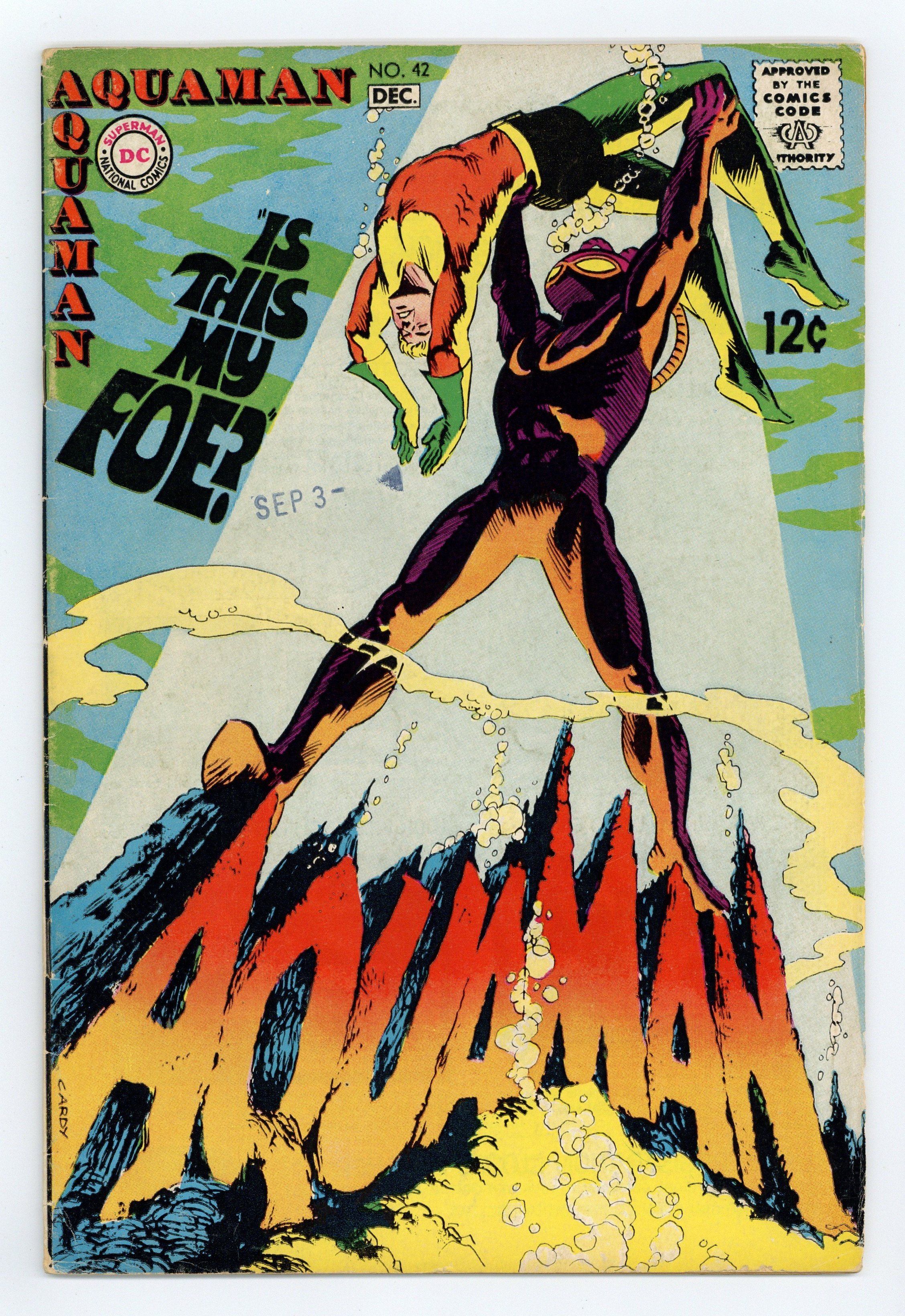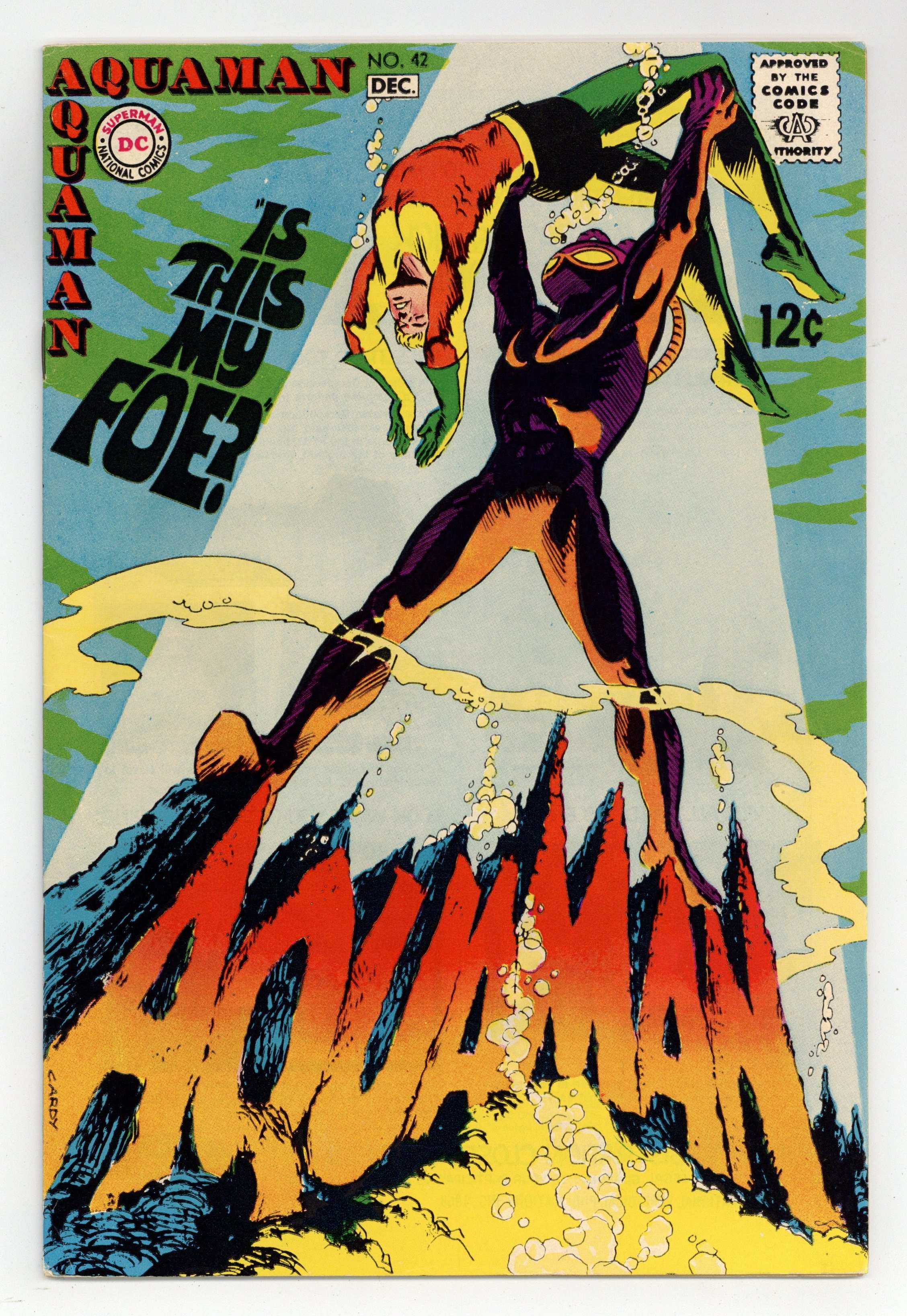 Cover art by Nick Cardy. Is This My Foe?, script by Steve Skeates, art by Jim Aparo; Aquaman, assuming Black Manta kidnapped Mera, goes after him; the Maarzons worship Black Manta as their god; Aquagirl worries that Narkan is becoming a tyrant. 36 pgs. $0.12. Cover price $0.12.