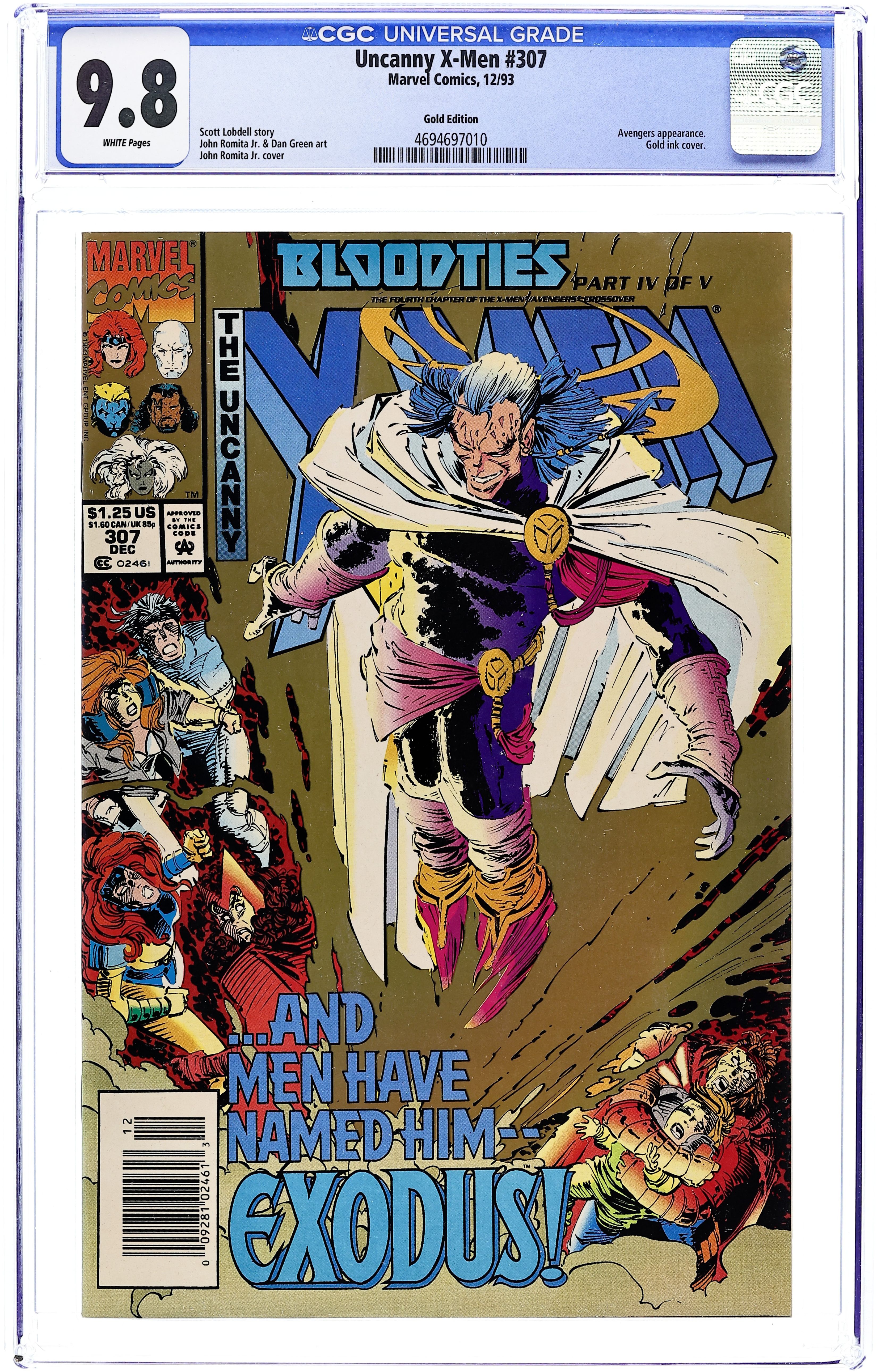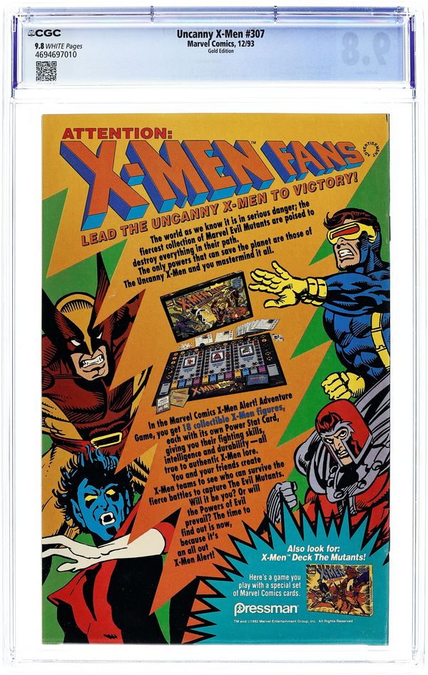 Pressman Promotional Gold Edition from "X-Men Alert Adventure Game", some copies were distributed with the boardgame, while other copies were obtained only by redeeming an exclusive in-game mail away offer. Low print run. Easily identified by the gold background. NOTE: 1 of 4 X-Men promotional variant issues given away by Pressman. The other three are Uncanny X-Men (1963) 1st series #297 & #303, and X-Men (1991) #11. Cover by John Romita, Jr. Bloodties Part Four: Night and Fog, script by Scott Lobdell, art by John Romita Jr. and Dan Green; Genosha explodes into conflict as the X-Men and Avengers try to save Luna from Fabian Cortez. Bloodties crossover. Genosha explodes into conflict as the X-Men and Avengers try to save Luna from Fabian Cortez. Continued from Avengers West Coast (1989 Series) #101; The story concludes in Avengers (1963 Series) #369. 36 pgs., full color. $1.25. Cover price $1.25.