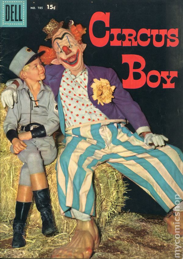10c Cover Price Edition. Photo Cover features Corky (Mickey Braddock [Mickey Dolenz, later of the musical group The Monkees]) and Joey the Clown (Noah Beery, Jr.). Stories by unknown. Art by Dan Spiegle. Featuring the tales "The Great Gambino" and "Counterfeit Clown"! Based on the 'Circus Boy' TV series. 36 pages, full color. Cover price $0.10.