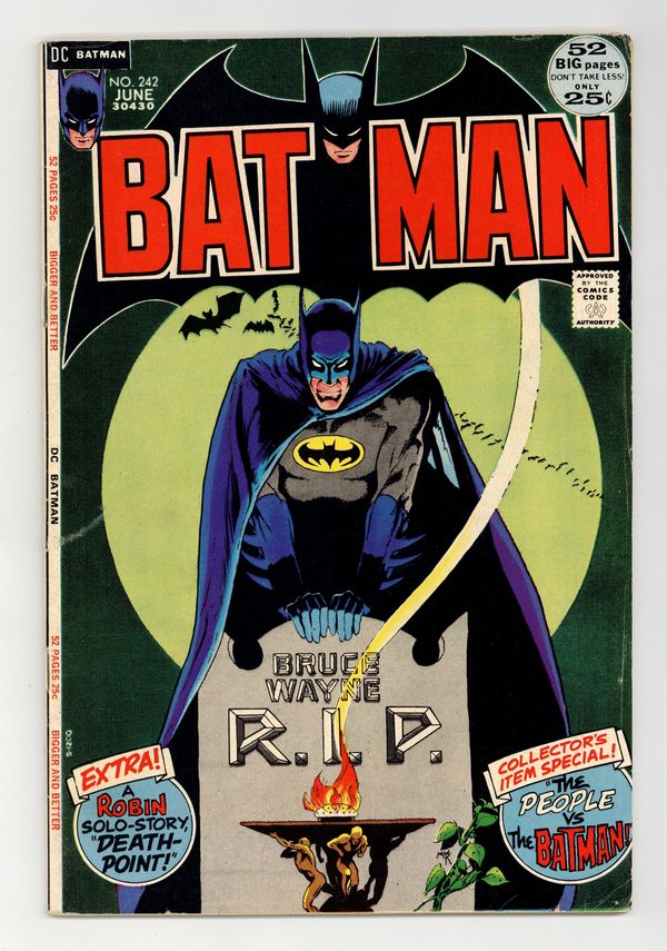 Ends Dec 22 7:39 PM CST Bid History no bids Minimum Bid $1 Your Secret Max Bid If you'd like to bid, please log in or register. 52-page giant. Cover art by Michael Kaluta. "Bruce Wayne--Rest in Peace!", script by Denny O'Neil, pencils by Irv Novick, inks by Dick Giordano; Batman begins his war against Ra's Al Ghul by faking Bruce Wayne's death and recruiting some allies. "Death-Point!", script by Mike Friedrich, pencils by Rich Buckler, inks by Dick Giordano; While battling Chthulu cultists, Terri is possessed by a demon. "The People Vs. the Batman," script by Bill Finger, pencils by Bob Kane, inks by Jerry Robinson and George Roussos; Weasel Venner wants to make sure that a fellow criminal doesn't make public the fact that he is the head racketeer in Gotham City, so he arranges for someone to be set up for the murder of Horatio Delmar: that someone being Bruce Wayne! 52 Pages, Full Color. Cover price $0.25.