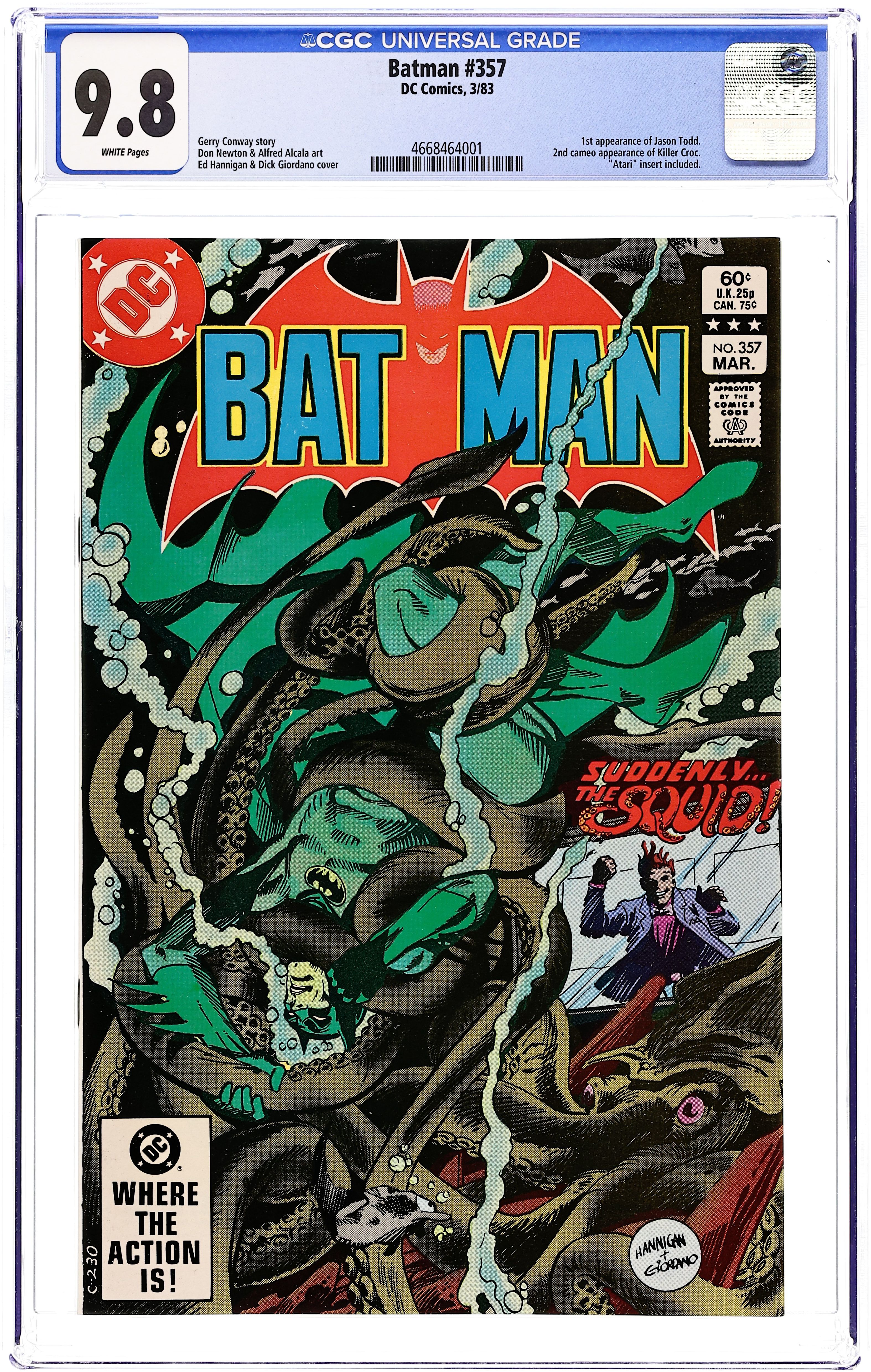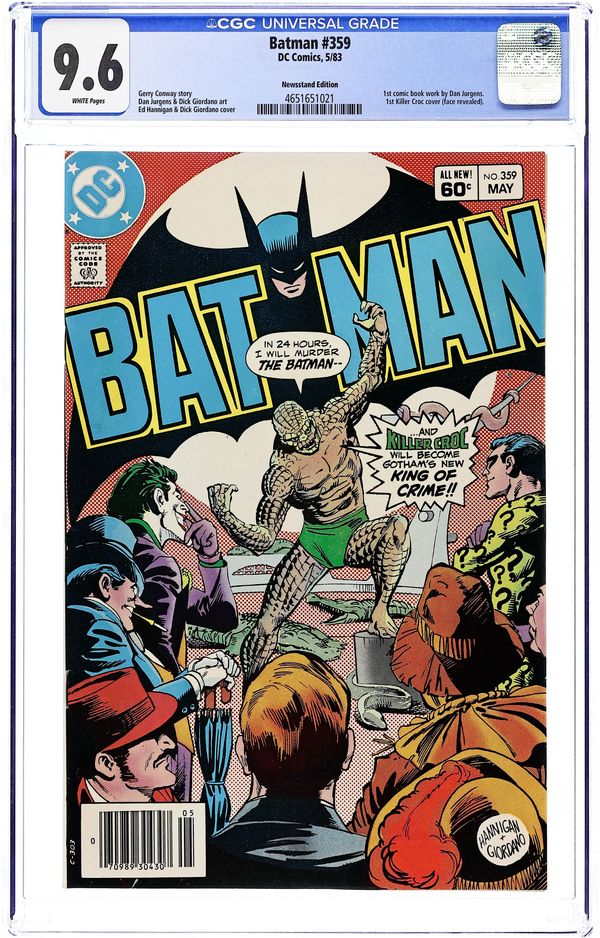 Direct Edition. Cover pencils by Ed Hannigan, inks by Dick Giordano. 1st full appearance of Killer Croc in "Don't Mess with Killer Croc!" starring Batman, Robin, Commissioner Gordon, Alfred Pennyworth, Trina Todd, and The Squid, script by Gerry Conway, pencils by Curt Swan, inks by Rodin Rodriguez; With the Squid eliminated, Killer Croc appoints himself the new head of the Gotham Underground as Batman puts together the pieces of Killer Croc's involvement in the Squid's death. 36 Pages, Full Color. Cover price $0.60.