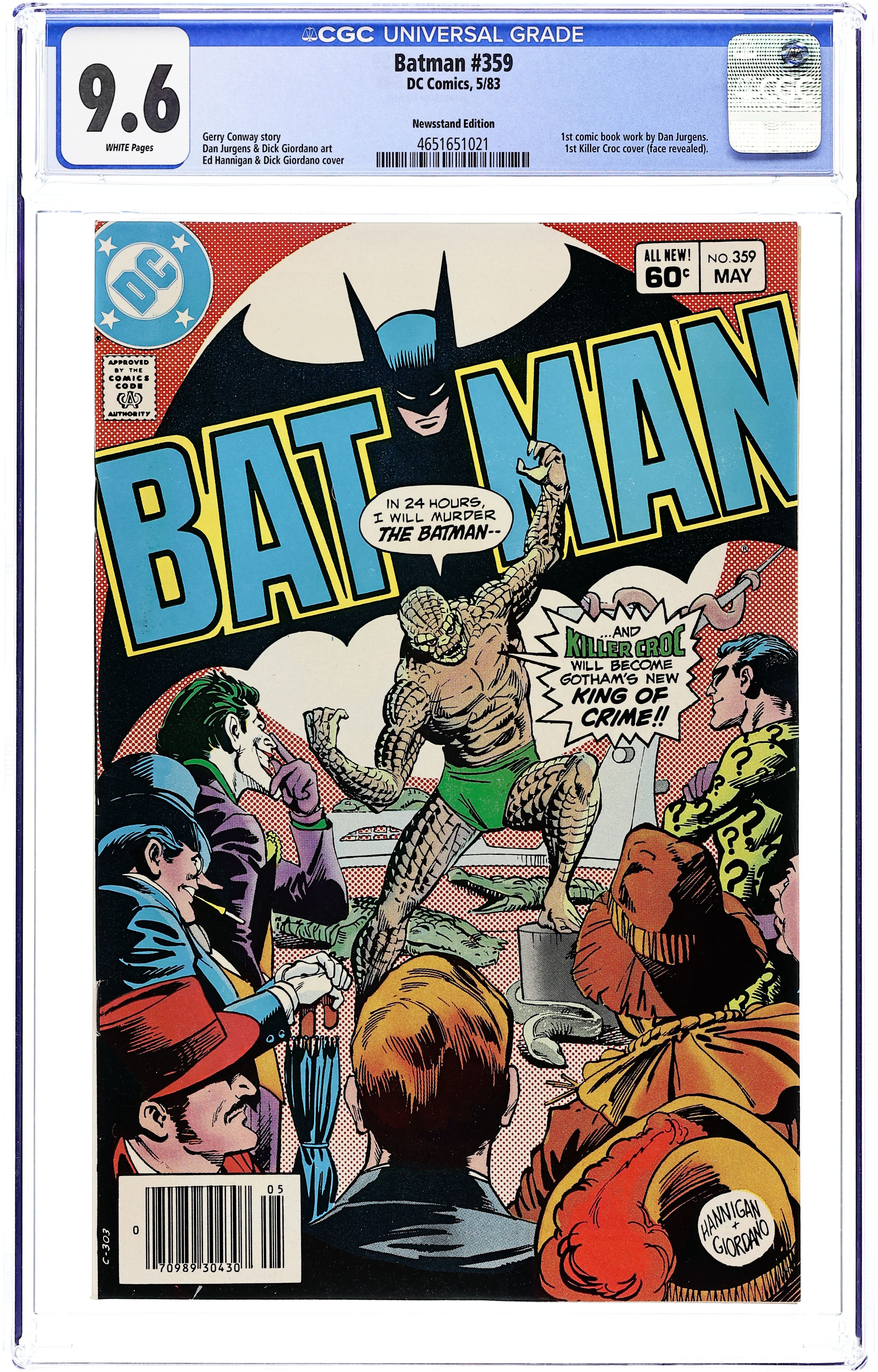 Direct Edition. Cover pencils by Ed Hannigan, inks by Dick Giordano. Jason Todd becomes a continuing character in "Hunt" starring Batman, Dick Grayson, Jason Todd, James Gordon, Vicki Vale, Alfred Pennyworth, Waldo Flynn, Trina Todd, Joe Todd, and Killer Croc, script by Gerry Conway, pencils by Dan Jurgens, inks by Dick Giordano; Featuring the origin of Killer Croc!; Batman searches for the whereabouts of Killer Croc while Croc himself breaks into Gotham City Jail to take care of the last obstacle in his path toward ruling the Gotham Underground. 1st comic book work by Dan Jurgens. 36 Pages, Full Color. Cover price $0.60.