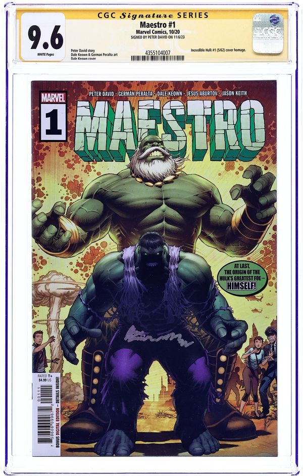 Written by Peter David. Art by German Peralta and Dale Keown. Cover by Dale Keown. THE STORY YOU'VE WAITED DECADES FOR: THE ORIGIN OF MAESTRO! Almost 30 years after the landmark story Future Imperfect, legendary INCREDIBLE HULK scribe Peter David returns to the far-future version of the Hulk known as Maestro - the master of what remains of the world. With astounding art from HULK veteran Dale Keown and up-and-comer Germán Peralta, Maestro will answer questions that have haunted Hulk fans for years - and inspire some new ones. How did the world fall and the Maestro rise? What happened to the world's heroes in between? And where is the Hulk we know and love? Find out here! 36 pages, full color. Rated T+ Cover price $4.99.