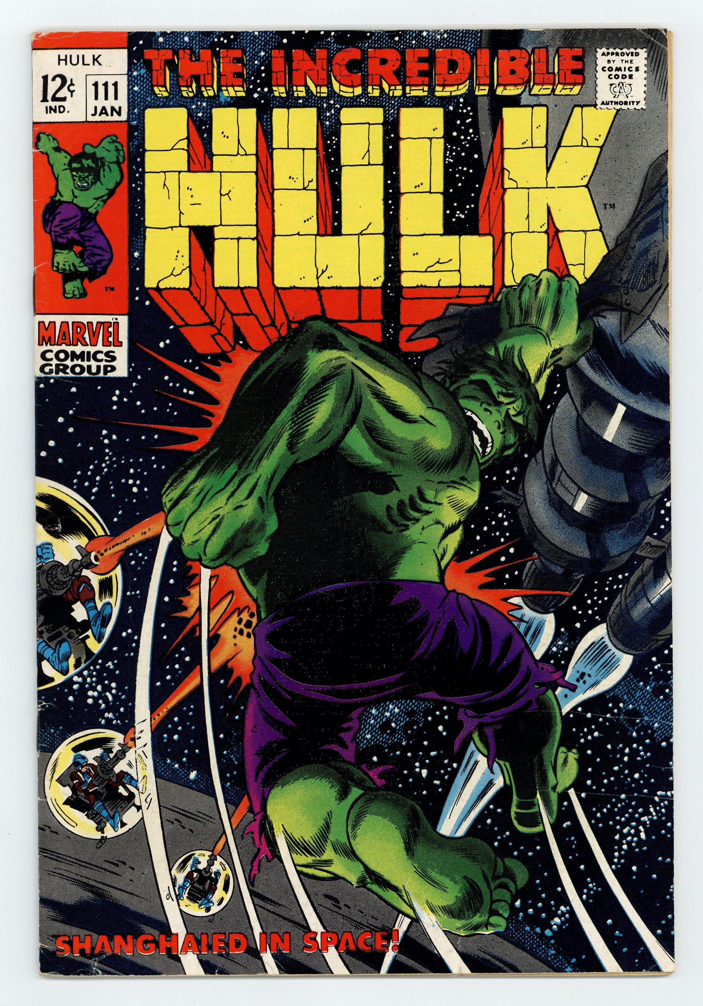 Cover pencils by Herb Trimpe, inks by Dan Adkins. Shanghaied In Space!, script by Stan Lee, pencils by Herb Trimpe, inks by Dan Adkins; The aliens who sent Umbu to destroy the earth capture Bruce Banner after the Hulk defeats their killer robot; Bringing him back to life (Bruce died at the end of last issue), the aliens find they have their hands full as they wage a pitched space battle with Bruce's alter ego, the incredible Hulk; Making it to their home planet, Hulk finds himself faced with the awesome might of the Galaxy Master. 36 pgs. Cover price $0.12.