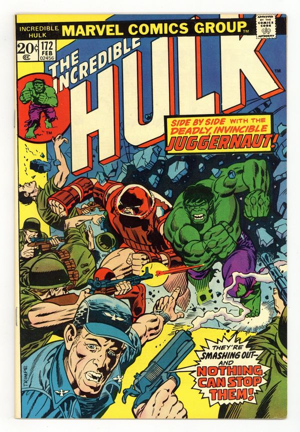Cover art by Herb Trimpe. And Canst Thou Slay... the Juggernaut?, script by Steve Englehart (plot) and Tony Isabella (script), pencils by Herb Trimpe, inks by Jack Abel; Hulk has been captured and put in a holding cell at Hulkbuster base; As he is quickly dismantling the walls of his prison, Armbruster calls on Peter Corbeau who brings a ray to teleport the Hulk to another dimension; Hulk is blasted away but the Hulkbusters find themselves facing the Juggernaut in his place; When they try to use the ray again, the Hulk returns as well and the two powerhouses quickly bust out and get away; Hulk quickly finds he does not like his new ally and the two battle; The X-Men show up to capture Juggernaut but allow the Hulk to escape. Appearances by the X-Men (Professor X, Cyclops, and Marvel Girl in a crossover with Avengers 111), plus cameos by Doctor Strange, the Angel, the Beast, and Iceman. 36 pgs. $0.20. Cover price $0.20.